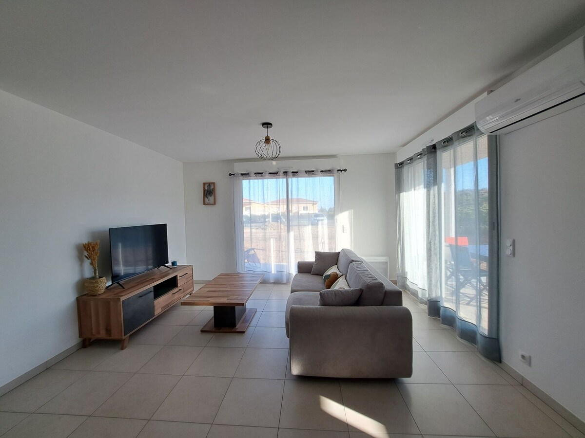 Byt je nový, jsou zde dvě ložnice, velmi světlý obývací pokoj s vstupem světla a proskleným výklenkem s výhledem na krytou terasu. Nachází se nachází centrum vesnice s pekárnou, řeznictvím, lékárnou, trafikou a 2 bary s restaurací. Vesnice se nachází 10 minut od Pézenas, 25 minut od Lac du Salagou a 30 minut od pláží. Milovníci přírody si mohou v okolí užít mnoho procházek či výletů na kole.