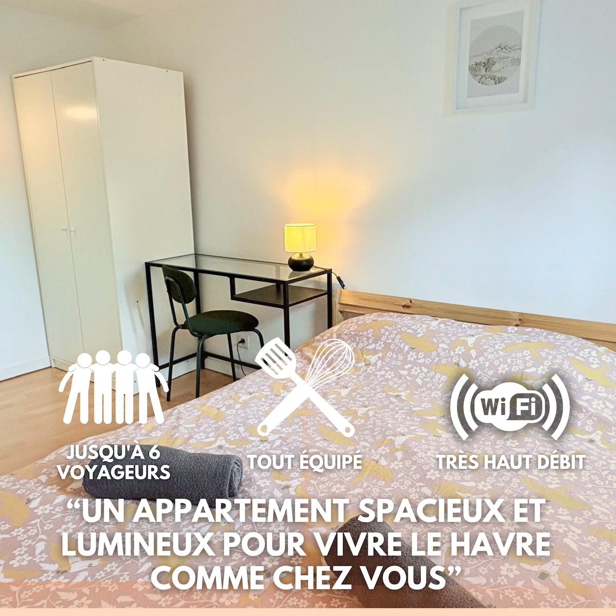 Tento apartmán je ideální pro 2 osoby a v obývacím pokoji se může ubytovat až 3 osoby s rozkládací pohovkou (se skutečnou matrací). Tento stylový a světlý byt se nachází v klidné oblasti s veškerým vybavením v docházkové vzdálenosti a je ideální pro úspěšný pobyt v Le Havre. Zamilovaný do tohoto města, který je tak příjemný na život, určitě doporučíme jeho nejlepší adresy.