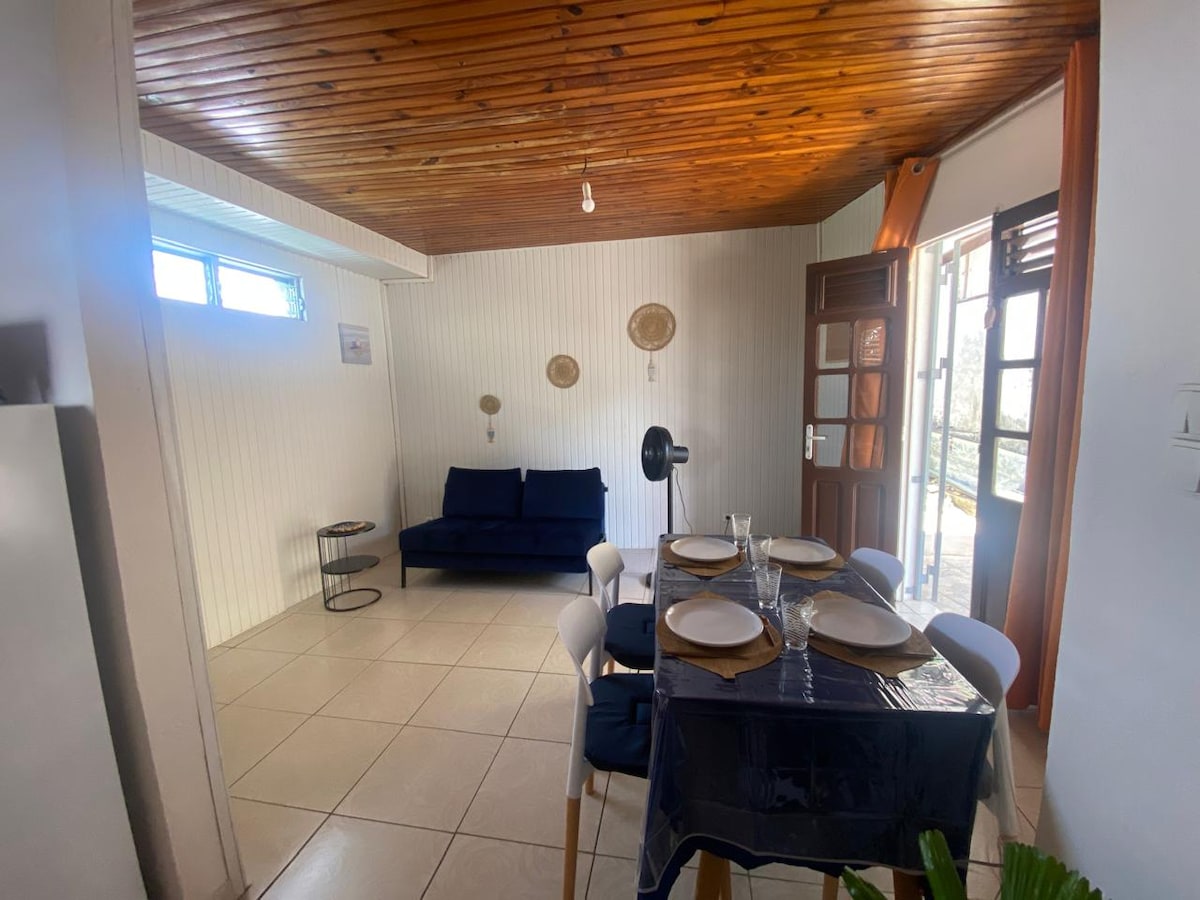 Bas de villa tout confort, vue mer, WIFI fibre , parking privé, piscine, douche extérieur, mobilier de jardin. Idéalement situé pour explorer le sud et le nord de la Martinique, centre commercial et TCSP à 5 mn à pied. Séjour avec brasseur d'air, canapé lit 160x200, cuisine équipée , chambre 1 CLIMATISEE LA NUIT DE 18,30 à 8 h du matin avec lit 160x200. chambre 2 avec brasseur d'air lit 180x200 convertible en deux lits , salle d'eau, WC indépendant. barbecue. Apéritif au court de votre séjour.
