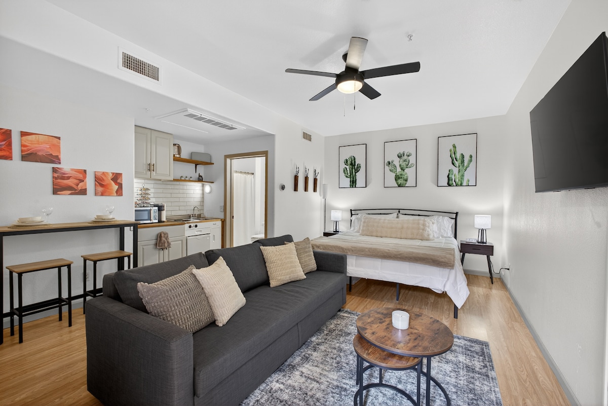 The Hill's Bungalow, a wonderfully charming casita with a separate private entrance and parking. Walk out in the morning, watch the sunrise and sit on the private back porch for sunset. Custom finishing's and large windows opens to a gourmet kitchen/ large common room, a half bath, 50" TV and high speed wifi. A sleep number king bed with a lavish full bath, makes relaxing easy. Walking to hiking trails, a 2 minute drive to FH downtown, 10 minutes to Scottsdale, or 35 minutes to Sky Harbor.