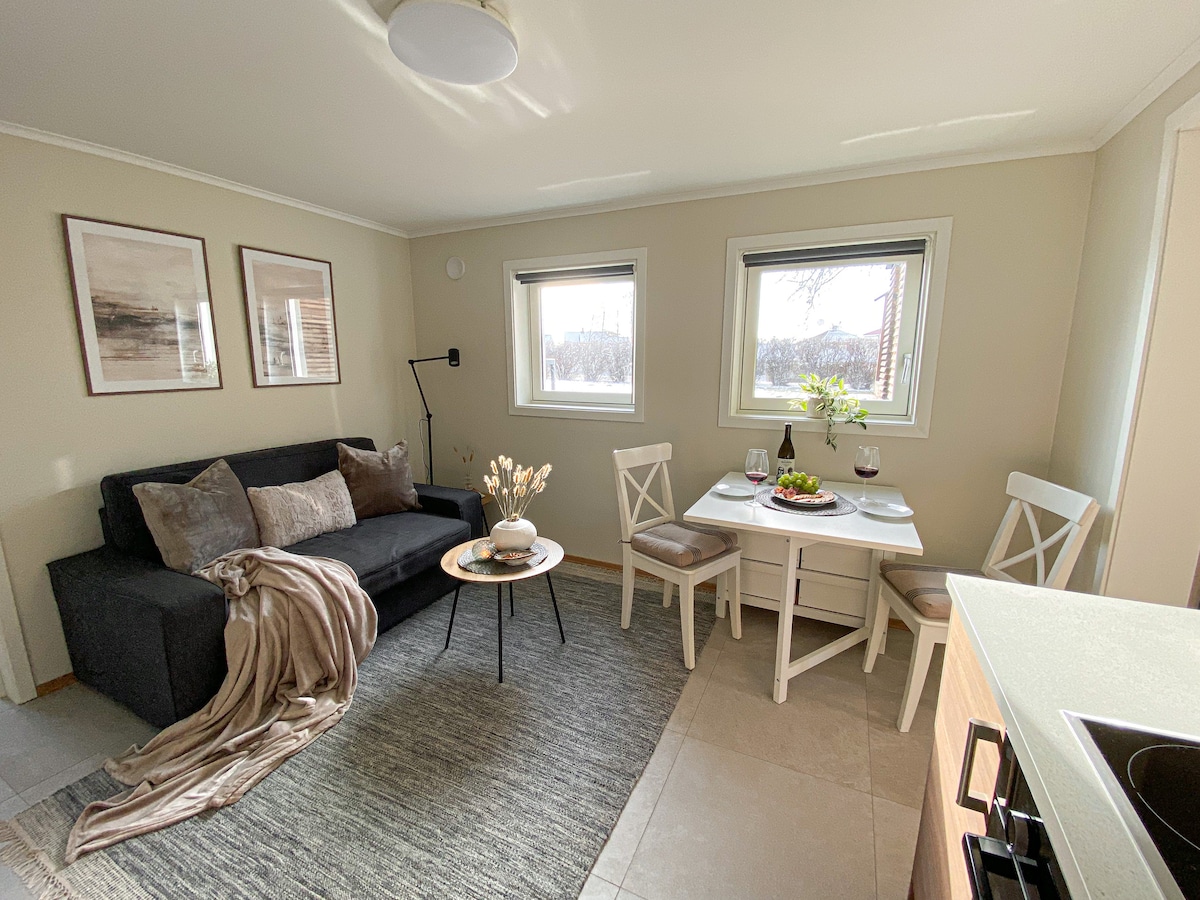 Útulný penzion v blízkosti centra města. Apartmá s příjemnou koupelnou, velkou luxusní manželskou postelí s novými péřovými přikrývkami a polštáři a jemným bílým ložním prádlem, které působí lahodnému hotelu. Posezení a televize s Netflixem, HBO, Disney+ atd. Vybaven kávovarem Nespresso, lednicí, mikrovlnnou troubou a rychlovarnou konvicí. Útulná zahrada s posezením a grilem. 12 minut od letiště Torp. 200 metrů od autobusu. „Moc ti za všechno děkujeme, byl to náš nejlepší AirBNB v Norsku“ - Hostitelský komentář, listopad 2023