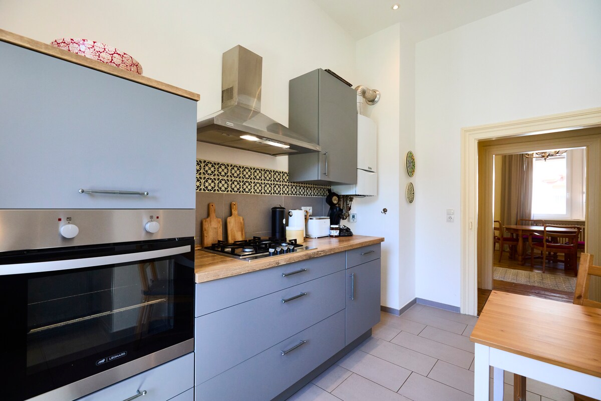 Nově zrekonstruovaný byt ve starém domě 5 minut pěšky od centra města s výhledem na zahrady. Byt má podlahové prkna, moderní koupelnu a moderní vestavěnou kuchyň. K dispozici jsou také 3 láskyplně zařízené, světlé pokoje. Manželská postel v ložnici může být rozdělena na 2 samostatná lůžka. Byt se nachází v půvabné 3 rodinné staré budově z roku 1900 v 1. patře. V bezprostřední blízkosti se nacházejí malé obchody, supermarket a park.