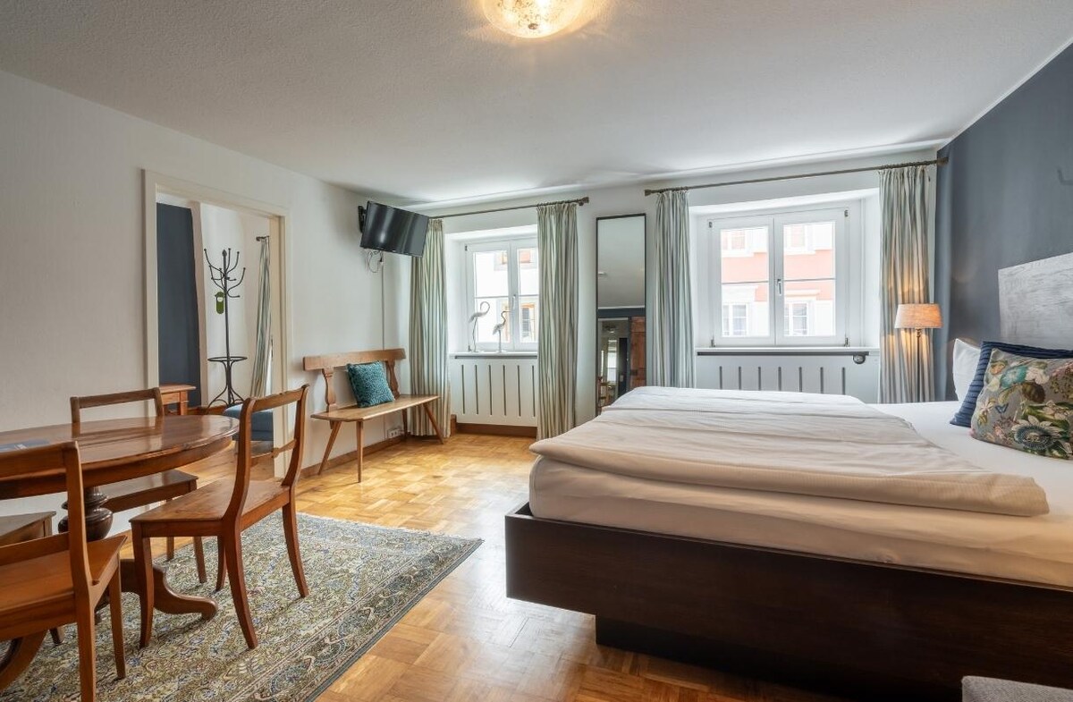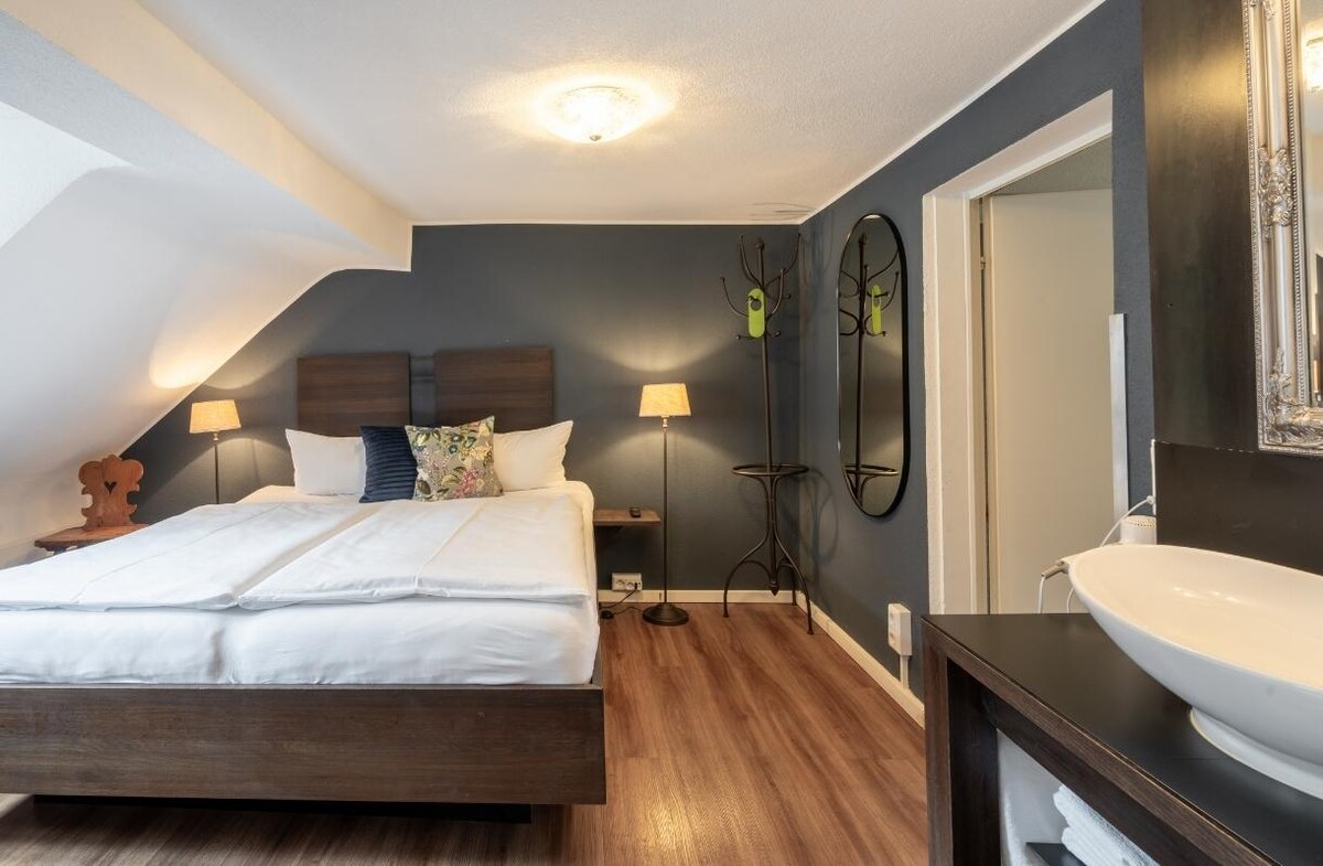 Naše romantické dvoulůžkové pokoje se nacházejí jak v naší historické hlavní budově s výhledem na staré město, tak v klidnější zadní části hlavní budovy nebo v modernizované přístavbě. Na věšáku nebo ve skříni je místo pro všechny oděvy, které jste si přivezli. Umyvadlo s fénem se nachází v pokoji, sprcha a WC jsou umístěny odděleně od pokoje. Teplota se v obou místnostech reguluje samostatně. Pokoje jsou vybaveny TV.
