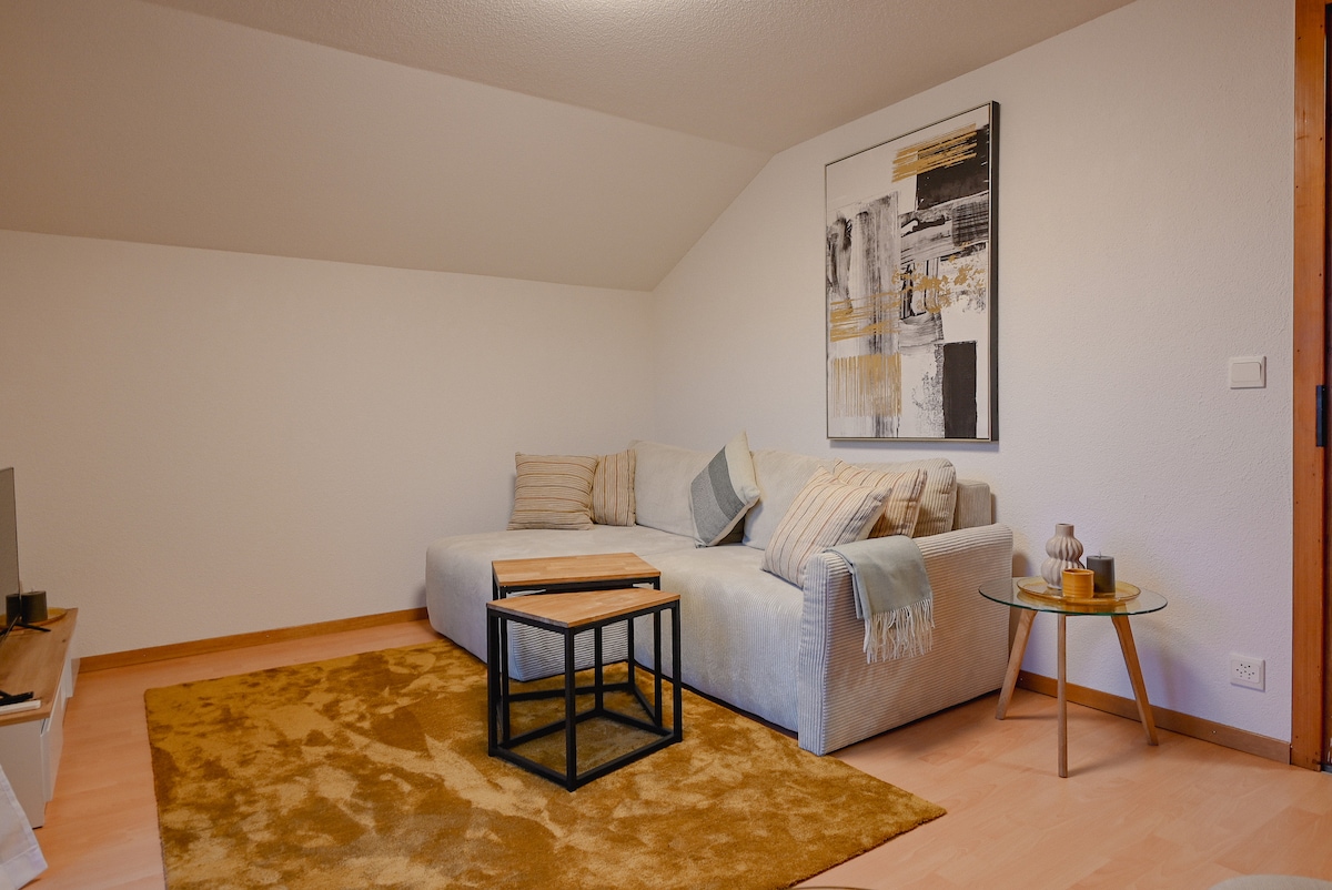 Ubytuj se v našem světlém podkrovním bytě jen 9 minut od Interlakenu a 3 minuty chůze od Thunského jezera. Nachází se přímo v centru obce, obchody a zastávka autobusu (do Spiezu a Interlakenu) jsou jen pár kroků daleko. Byt v nejvyšším patře má jednu ložnici s manželskou postelí, druhou manželskou postelí v obývacím prostoru, plně vybavenou kuchyň, jídelní kout, pohodlnou sedací soupravu s televizí, koupelnu, pračku a balkon s výhledem na hory. Parkování zdarma v ceně. Ideální pro rodiny, páry a přátele