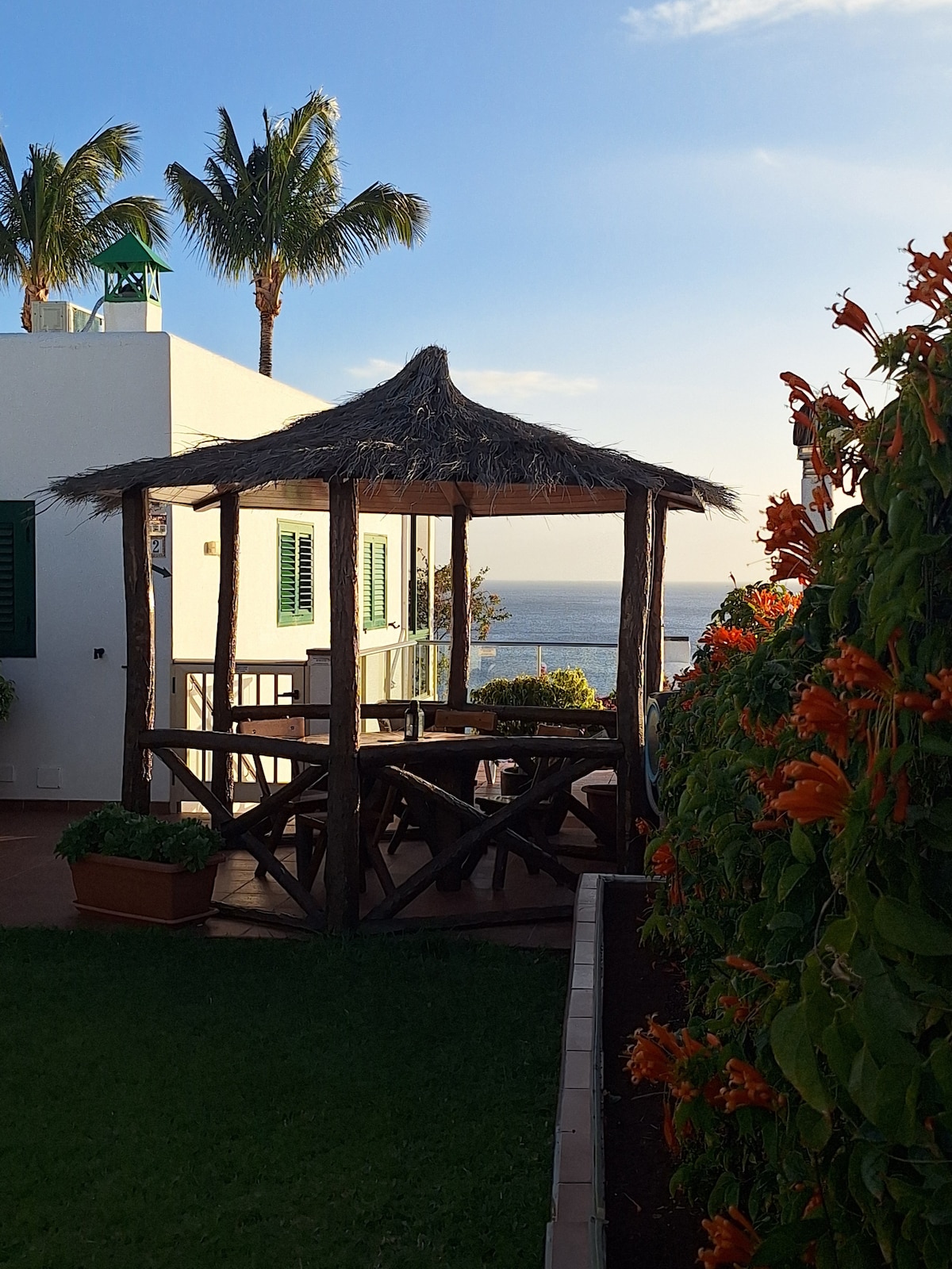 An oasis of tranquility right in the centre of Corralejo! This lovely and well decorated 2 bedroom apartment is ideally situated. From the spacious terrace you can enjoy the view of the massive pool, the lush garden and the sea! The apartment is situated 100 meters from the nearest beach. Right opposite the apartment you will find a tapas bar and restaurants. Just 50 metres around the block, there are shops, supermarkets and a private health clinic. No car required.