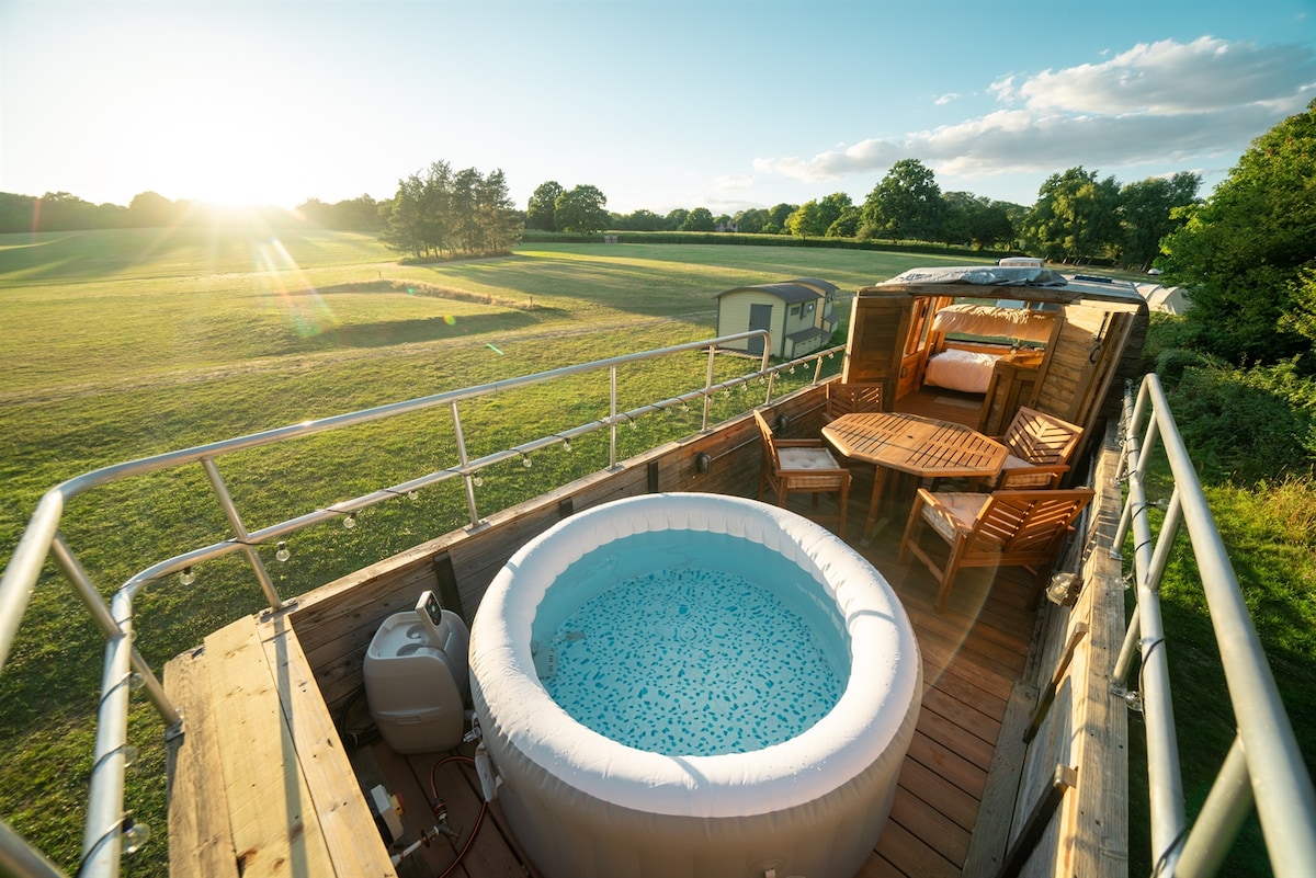 Unique Stay in a fabulous converted DOUBLE DECKER BUS! Oddechni si ve vířivce na střeše po dni stráveném touláním se po lese Bluebell Woods, hraním bláznivého golfu na místě, objevováním nedalekého Ashdownského lesa nebo místní vinice s ochutnávkou vína nebo si vychutnej zmrzlinu v místní zmrzlinárně. Autobus se může pochlubit super pohodlnou manželskou postelí v přízemí a evropskými palandami nahoře! Topení nahoře i dole, stejně jako vyhřívané přikrývky, aby bylo v chladnějších měsících příjemně a útulně! POUZE PRO DOSPĚLÉ od června do srpna