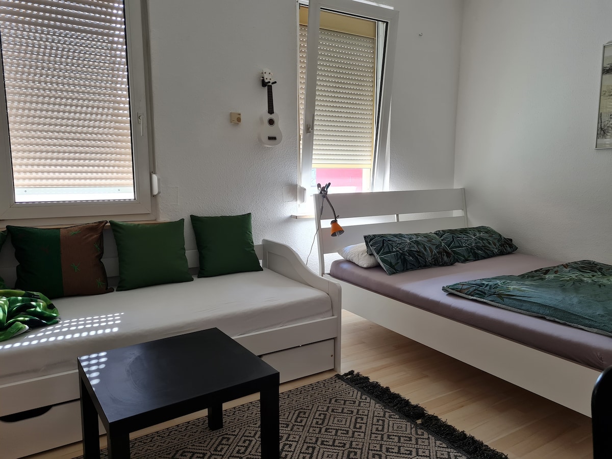 Ihr wohnt in unserem liebevoll augestatteten 33 m² Appartement direkt an den Rednitzauen, die Fürther Altstadt ist nur wenige Gehminuten entfernt. Das Fürther Mare (Therme) ist zu Fuß erreichbar. U-Bahn Anschluss direkt vor der Haustüre. Wir haben Schlafplätze für 4 Gäste, Kinder und Hunde sind herzlich willkommen. Wir haben das Appartemen mit viel Liebe zum Detail eingerichtet und hoffen dass Ihr Euch wohlfühlt.
