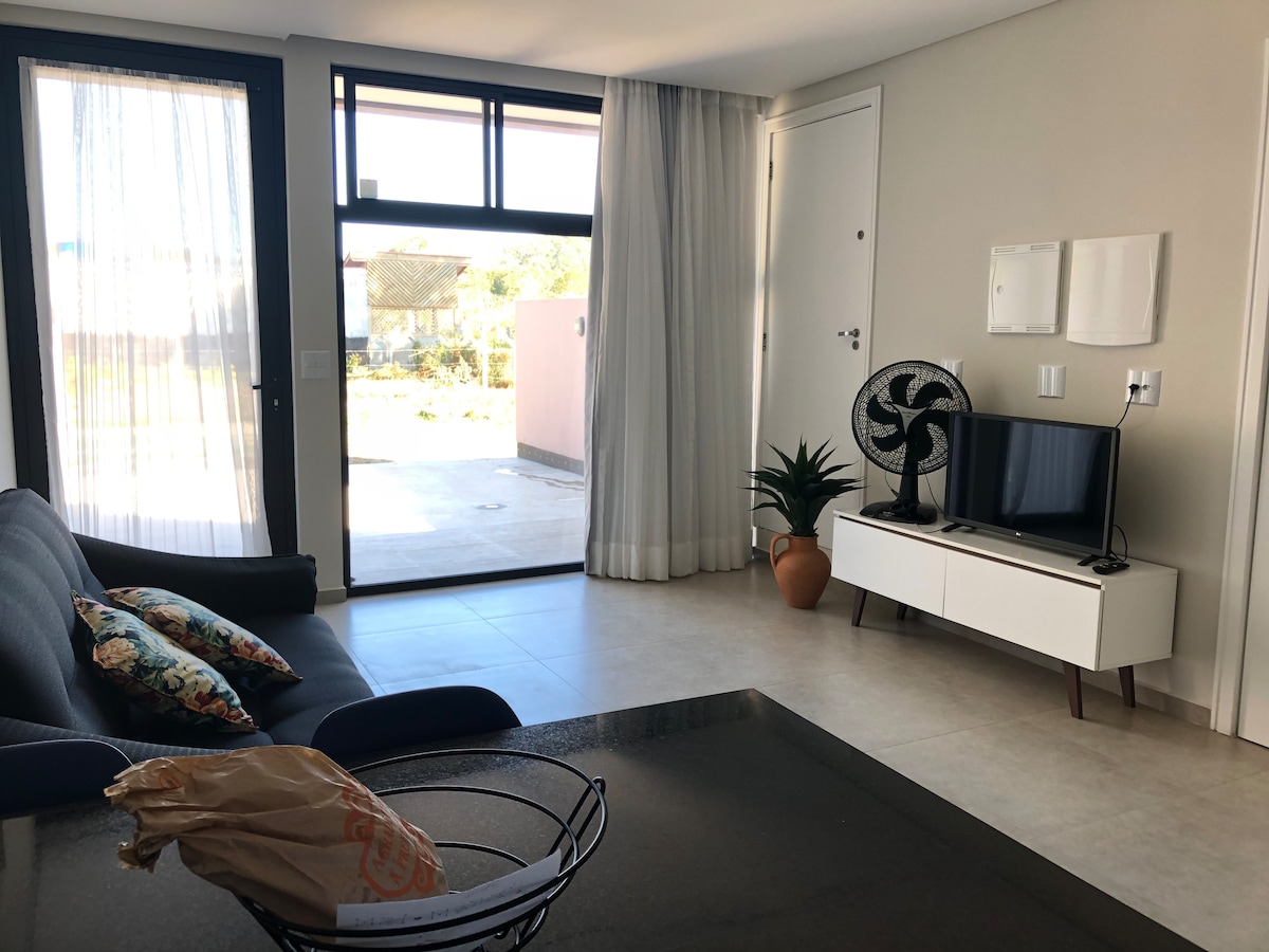 Nový luxusní loft uprostřed přírody v sousedství Morrinhos s částečným výhledem na moře a město Garopaba. Elektronický zámek, manželská postel, chytrá televize, klimatizace (teplá a studená), vysoušeč vlasů, plážové osušky, pračka/sušička Samsung, kávovar, mixér, toustovač, elektrická konvice, mikrovlnná trouba, varná deska, trouba, bluetooth reproduktor JBL. Soukromá terasa a společná zahrada. Loft se nachází v přízemí našeho domu. Sdílené parkování.