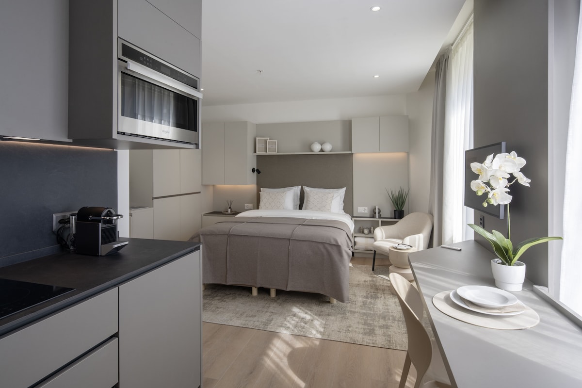 Toto moderní studio o rozloze 24 m² nabízí světlý, klidný prostor s elegantním, minimalistickým nábytkem v neutrálních tónech. Velké okno s průsvitnými a zatemňovacími závěsy zaplňuje místnost světlem. Zahrnuje dobře navrženou koupelnu se sprchou a plně vybavenou kuchyň, která kombinuje pohodlí a eleganci v optimalizovaném uspořádání. Octagon také nabízí přístup do fitness centra (v ceně) a zasedacích místností, snídaně a restaurací (za příplatek).