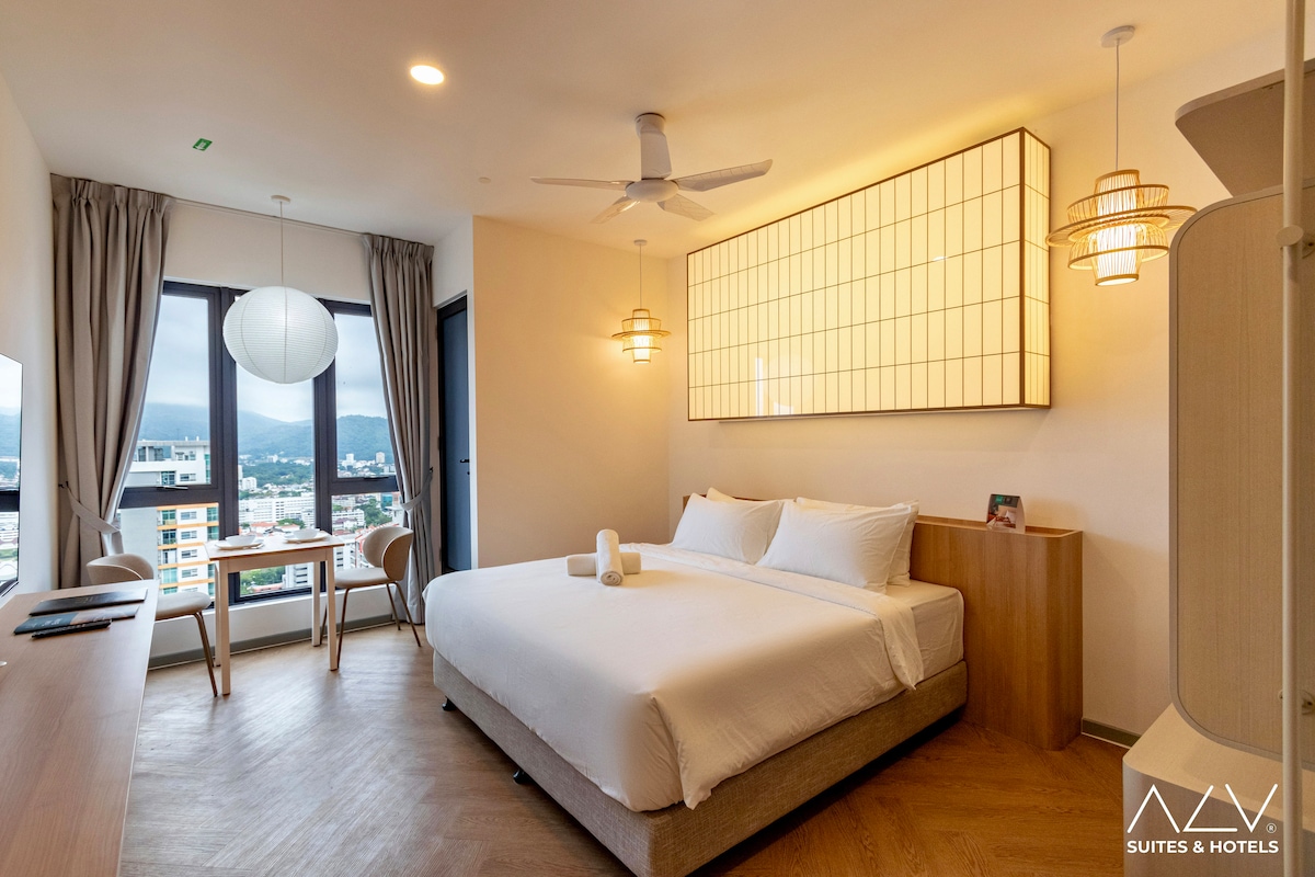 Kyomi , a Japanese-inspired studio at 22 Macalisterz is where comfort meets style. With Muji-style design, soft wood tones, and calming neutral hues, this minimalist retreat offers a peaceful escape in the heart of Georgetown. Ideal for solo travelers or couples, it includes a plush King Koil bed, kitchenette, fridge, and dining space—just minutes from Penang’s best food, culture, and charm.