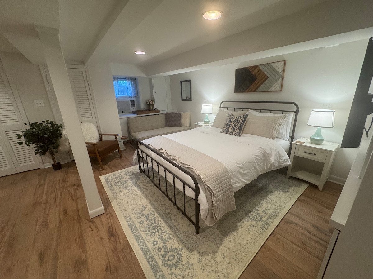 Georgetown/Burleith area renovated unit at english basement + Parking (additional fee) Modern studio + 1 Bath. Ideal for 2 but can accommodate 3. Has a queen bed and a comfortable chair bed for 1. Fully equipped kitchenette with small oven, air fryer, electric burner, and coffee maker. Coffee, tea, sugar, salt, pepper, dishwasher and soap provided for first days.