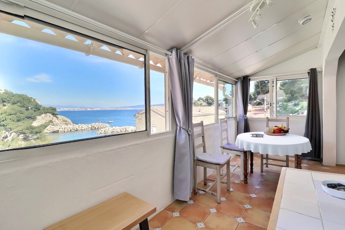 Okouzlující garsonka s velmi světlým ,klidným a nezávislým charakterem se nachází vysoko nad domem majitele. Velká koupelna s toaletou . Šatní skříň . Vybavená otevřená kuchyň. 2 modulární 90 lůžek podle potřeby (malá matrace navíc, pokud je to dítě . )Čtyřnozí společníci jsou vítáni . 100 m od moře .ballades in the calanques . Je lepší být přepravován/a, ale vlakové nádraží Sncf je přístupné pěšky
