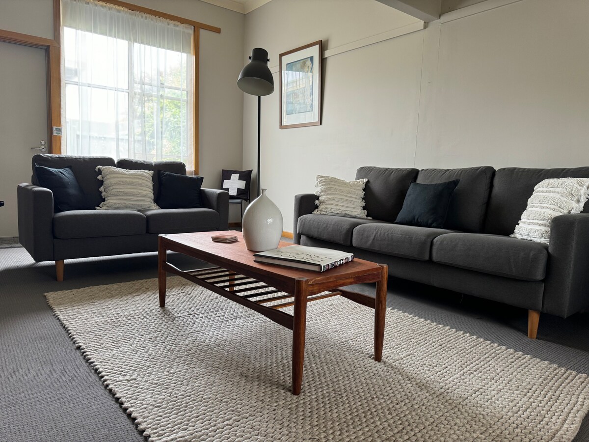 Air bnb for 2 in the heart of Loch Village Originally a gallery, Space On The Hill is a large free standing, open plan warehouse style space. It is in the heart of town, has views over rolling green hills and is 200 meters from the Great Southern Rail Trail. • 1 x queen bed • 1 x bathroom, walk in shower • Full kitchen • 2 x tables (dine/work) • Lounge space with 2 sofas • Separate comfy sofa bed • Super warm, huge split system heating / air con • Village bustling by day, serene by night