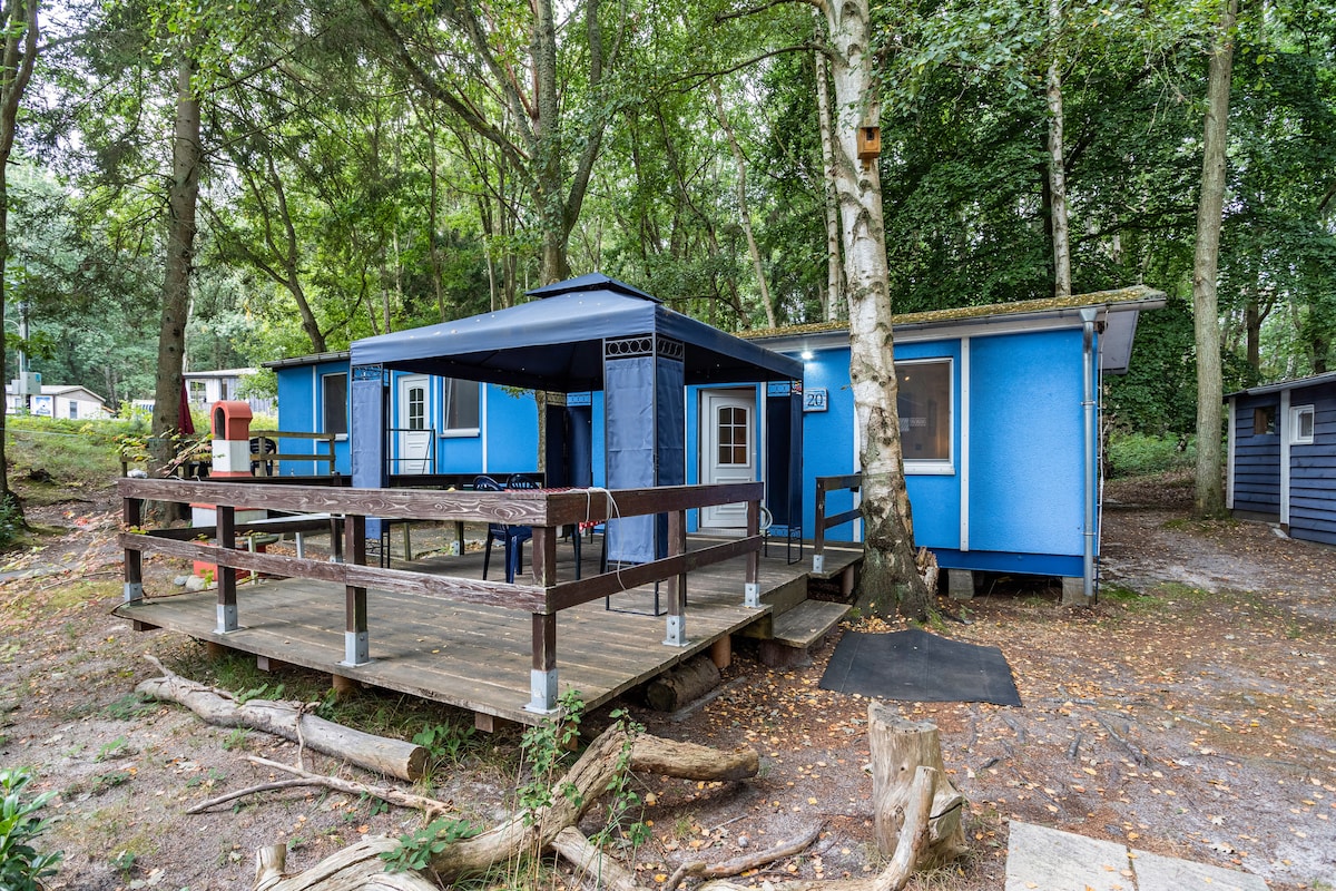 Přes terasu se dostanete do altánu. Uvnitř je obývací pokoj s kuchyňskou linkou. K dispozici je také indukční varná deska se 4 plotýnkami, trouba a myčka nádobí, stejně jako rychlovarná konvice, kávovar a mikrovlnná trouba. Gauč má funkci spánku a Smart TV 49 ". Ze samostatné ložnice se dostanete do sprchového koutu s WC. Pružinová postel je široká 1,80 m.