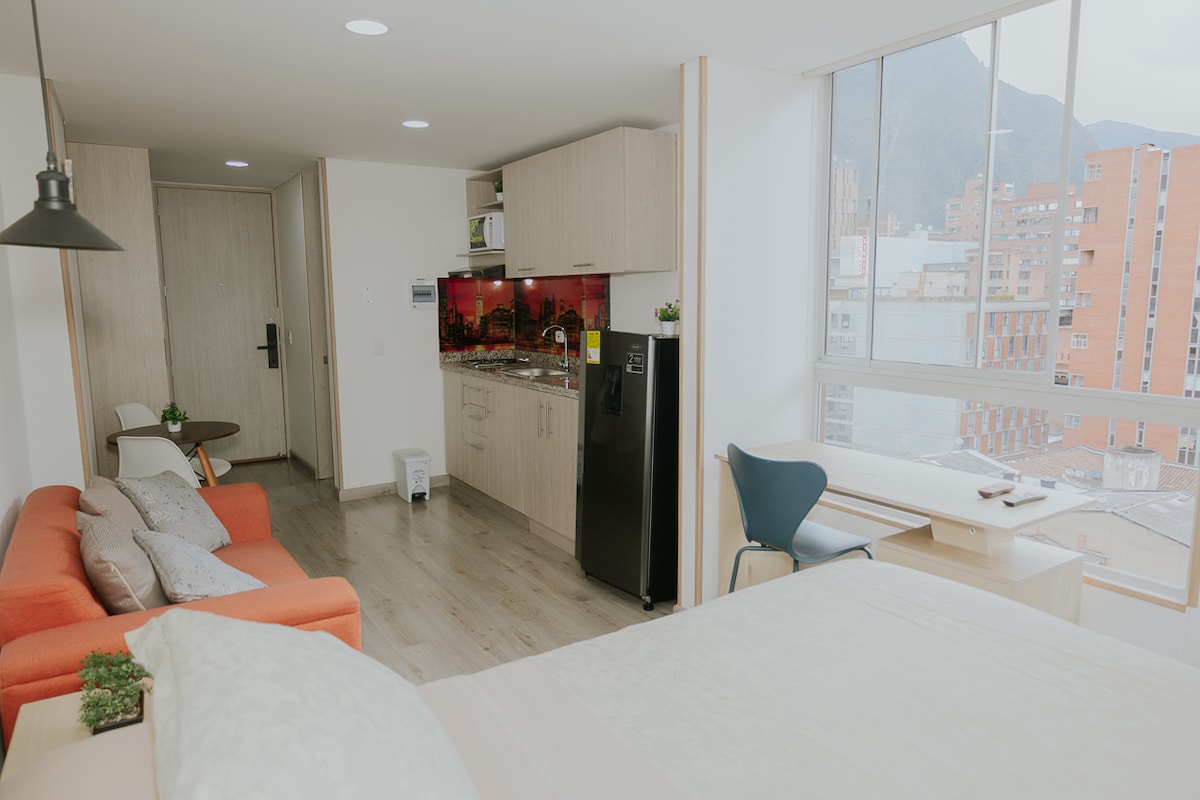 Okouzlující apartmá v srdci Bgtá, ideální pro páry nebo cestovatele. Elegantní výzdoba, vybavená kuchyně a pohodlná manželská postel. Soukromý balkon s úchvatným výhledem, společenské prostory, jako je Lavado Area, posilovna, kulečníkový stůl a stolní tenis, CoWo, terasa s grilem v nejvyšším patře s 360° výhledem a nonstop ostrahou. V blízkosti trhů, muzeí, restaurací v La Macarena, Monserrate, La Candelaria, Mall San Martín a Centro Internacional. Objev to nejlepší z Bogoty z tohoto nádherného apartmá!
