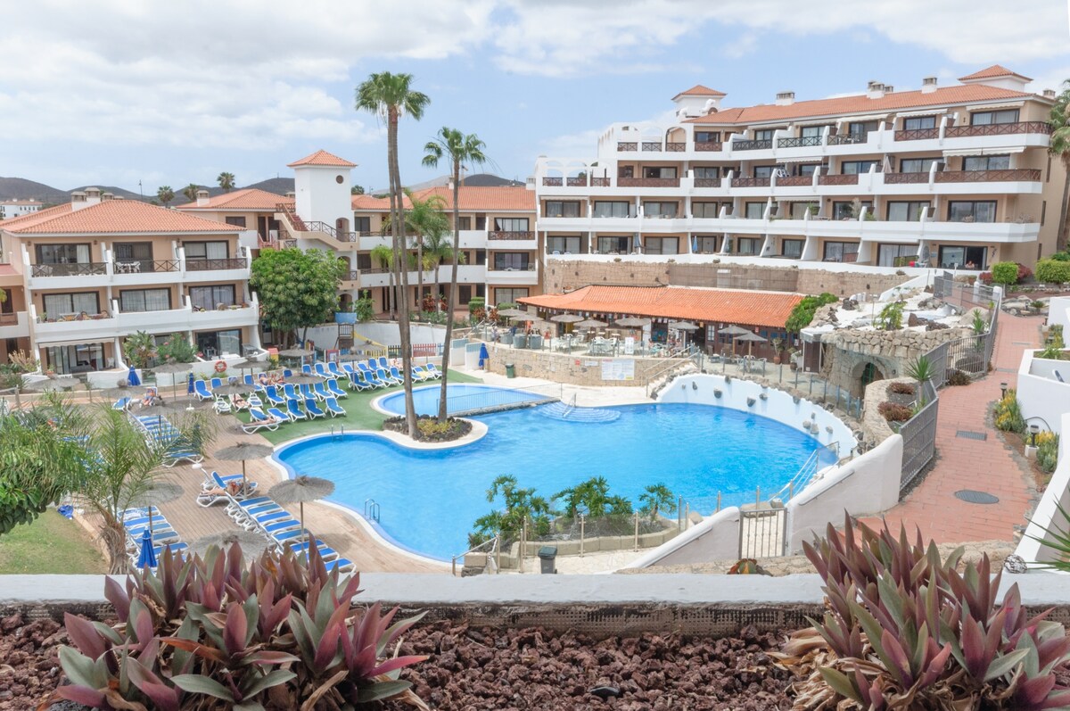 Romantický apartmán pro čtyři osoby v Golf del Sur, 5 minut od pláže a promenády s výhledem na moře. Tento byt ve Fairway Village se nachází v prvním patře a nabízí nezávislý vchod a výjimečný výhled na oceán a Teide. K dispozici je samostatná ložnice s manželskou postelí, obývací pokoj s kuchyní a rozkládací pohovkou, TV a pračka. K dispozici jsou tři bazény, bar a restaurace.