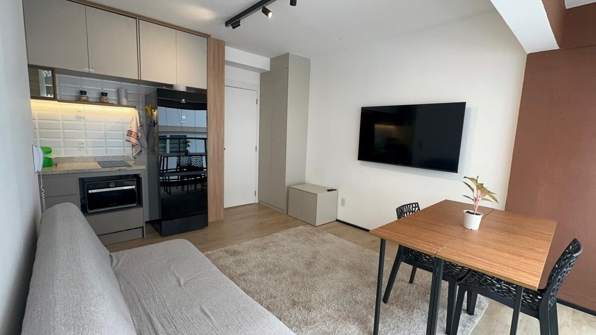 Nové studio v Bairro Paraíso. Zařízený, útulný a stylový, s klimatizací, manželskou postelí, 55" TV a dalšími prvky, které vám umožní zažít během vašeho pobytu v São Paulu neuvěřitelné zážitky. 5 minut pěšky od Av. Paulista, obchod Pátio Paulista a 3 stanice. Kompletní studio s: fritézou, mikrovlnnou troubou, minibarem, kuchyňskými potřebami, sendvičovačem, sprchou s teplou vodou…… **Adresa: Rua Mário Amaral, 311, Paraíso-SP.** MÁ RYCHLÝ INTERNET