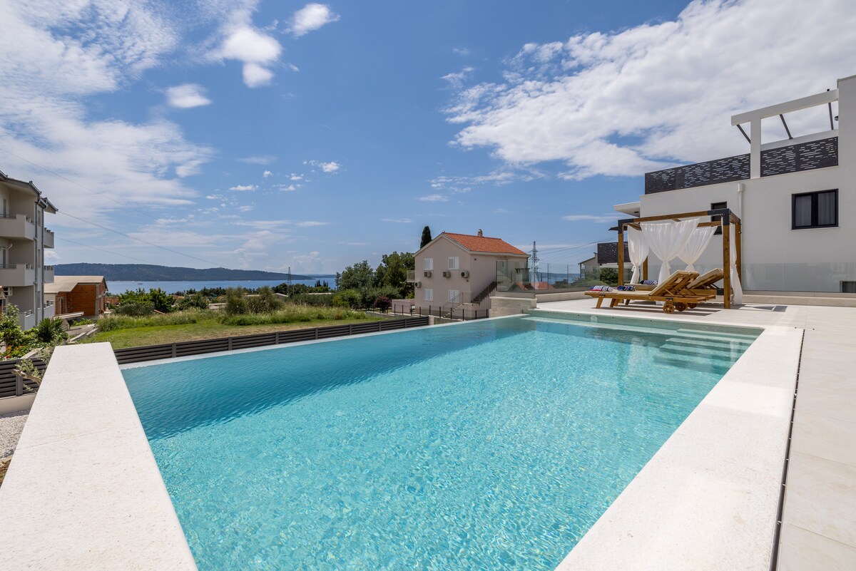 Užij si teplou, moderní vilu o rozloze 303 m² se 4 ložnicemi s vlastní koupelnou, navrženou pro pohodlí, soukromí a klidné chvíle. Novostavba. Poslední úkoly a obrázky, které je třeba udělat. Stále rezervovatelné. • Vyhřívaný bazén se slanou vodou • Extra horká vířivka • Výhled na moře a hory • Plně vybavená kuchyň + Smart TV • Rychlé WiFi připojení • Venkovní kuchyň, obývací pokoj a jídelna • Klidná oblast, 1 km od pláže • V blízkosti Splitu a Trogiru • Inteligentní samoobslužné ubytování a rychlá podpora hostitele • Ideální pro rodiny, páry a přátele