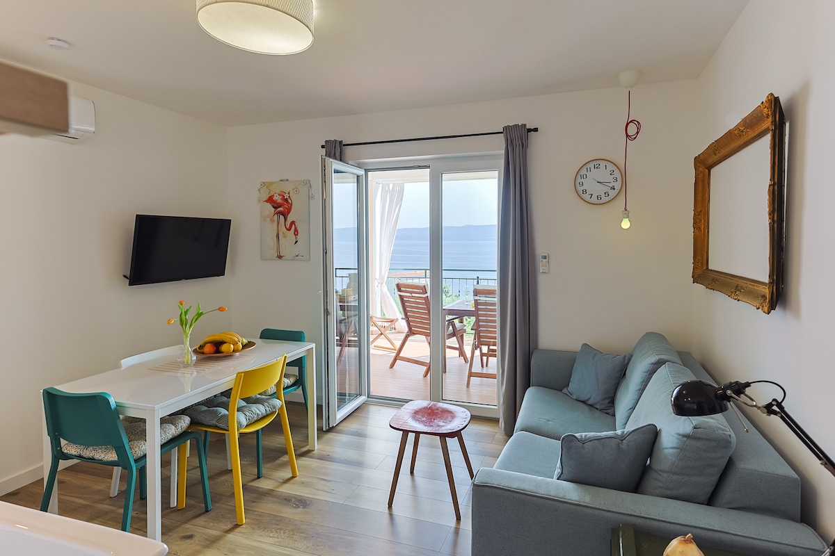 Tento krásně zařízený apartmán se nachází v podkroví rodinného domu. Má 1 pokoj, obývací pokoj s kuchyní a koupelnu. Před apartmánem se nachází velká terasa se zahradním nábytkem. Část terasy je zastřešená, takže hosté mohou být i v nejžhavějším slunci ve stínu. Odpočinek na terase zpříjemní výhled na moře, historické město Omiš a klisury nad ním. Moře je vzdáleno cca 300 m a lze se k němu dostat po schodech nebo klikatící se místní silnici.