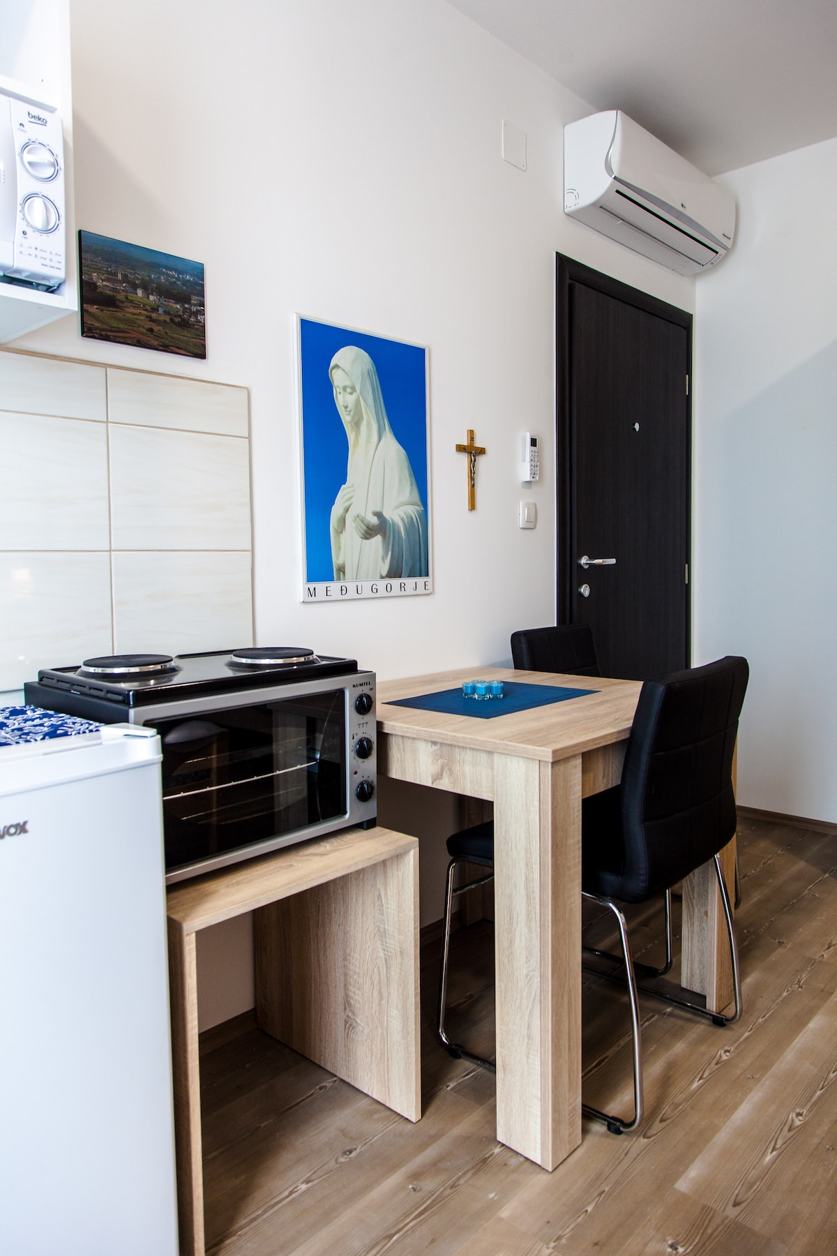 Náš byt se nachází v Medžugorji, na hlavní ulici, pět minut chůze od kostela St. James, nový a svěží, nabídne vám klidný pobyt. Hlavní autobusové nádraží je vzdáleno jednu minutu chůze, stejně jako supermarket, restaurace, obchody se suvenýry v blízkosti, také ve stejné oblasti najdete pekárnu s čerstvým a chutným pečivem, vše je na dosah ruky.