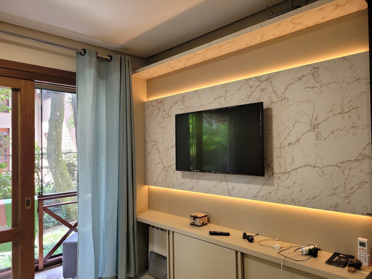 Velkolepé apartmá se svítkem, s manželskou ložnicí, obývacím pokojem, 2 pokoji a kuchyní, vše zařízeno na vysoké úrovni, s nádherným výhledem. Moderní, se všemi dostupnými zdroji, aby byl váš pobyt nezapomenutelný, spolu s nejkrásnějším výhledem na Serra Gaúcha. Spousta zeleně, možnosti pro volný čas a pohodlí všude kolem. K dispozici je vířivka, ambientní osvětlení, lednice, mikrovlnná trouba atd.