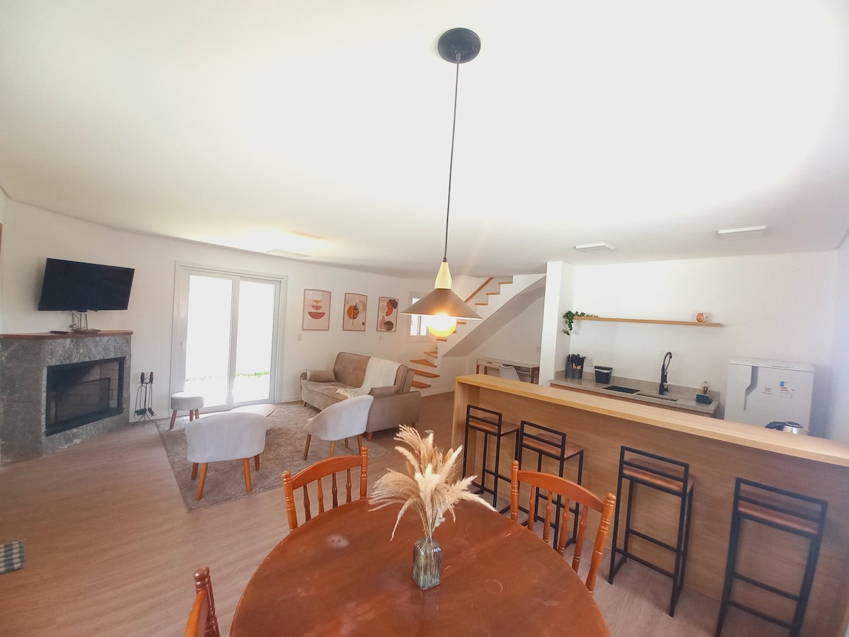Prostorný a útulný dvoupatrový dům, ideální pro ty, kteří hledají pohodlí v Serra Gaúcha. Díky dvěma dobře rozděleným podlažím nabízí řadový dům prostorné a světlé prostředí, ideální pro chvíle odpočinku s rodinou, jako pár nebo s přáteli. Dekorace kombinuje šarm serrana s moderními prvky, což zajišťuje útulný pobyt v každém ročním období. Obývací pokoj s otevřenou kuchyní je ideální pro relaxaci po prohlídkách regionu, zatímco pohodlné pokoje zajišť klidné noci.