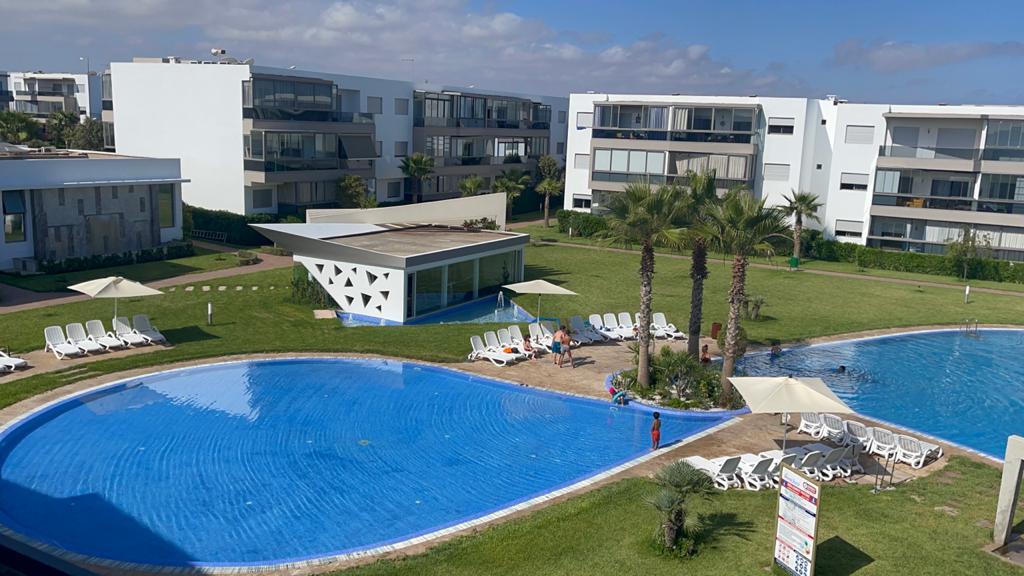 Ce logement paisible offre un séjour détente pour toute la famille. Résidence propre et sûr avec une sécurité 24h/24h , à 2 mn de la plage, avec 2 piscines, un terrain de foot, basket,pétanque et un parc de jeu pour enfants. L'appartement est situé au premier étage il est composé de 2 chambres,salon et un grand balcon vue sur piscine, une cuisine américaine bien équipée, Wifi,télé..dans la résidence il y'a un café, une supérette ..
