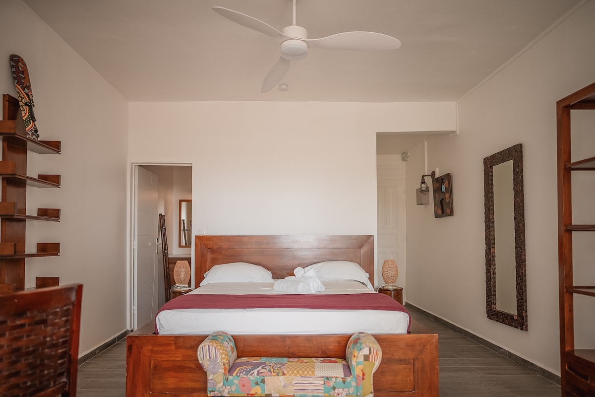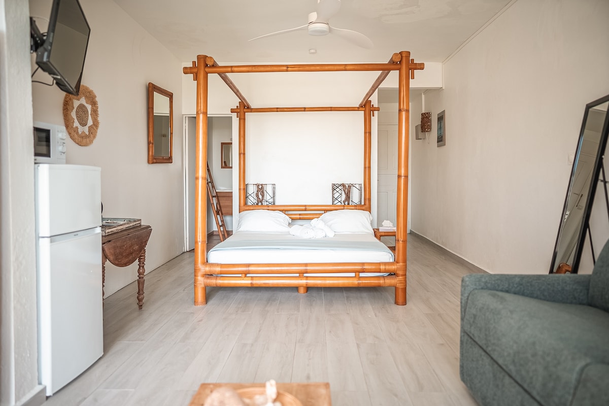 Face à la piscine, confortable et charmante, la suite Junior Soleil vous accueille à 2, 3 ou 4 personnes. Elle accueille un lit Queen size à baldaquin, un canapé convertible très confortable, des rangements et un téléviseur. Coté terrasse, l'espace repas et la kitchenette permettent de rester autonome mais le service petit déjeuner et dîner sont également possibles côté restaurant. Son patio vous séduira pour le farniente dans le hamac ou les chaises longues.
