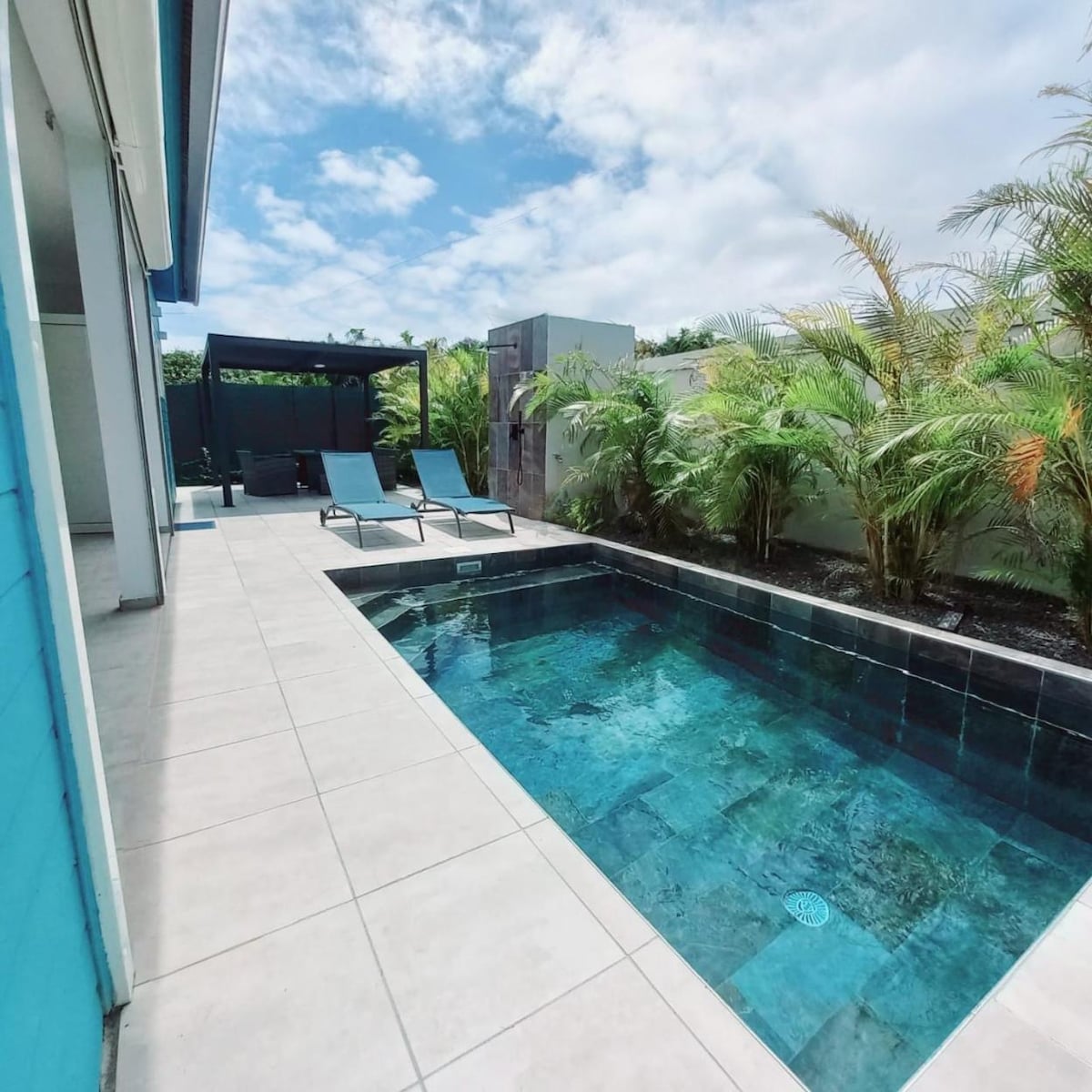 Moderní vila Mango Mika bez schodů. Impasse Mirano Kancel au Gosier. Tichá oblast Dampierre Centrální zeměpisná poloha ideální pro objevování Guadeloupe Large living room of 50m2 with equipped US kitchen and large living room open to 2 terraces of 100m2 around a 7x4m salt pool and a tropical garden 3 velké klimatizované ložnice: hlavní apartmá s vlastní koupelnou a 2 další ložnice s přístupem do další koupelny a toalety Wifi, parkování zdarma