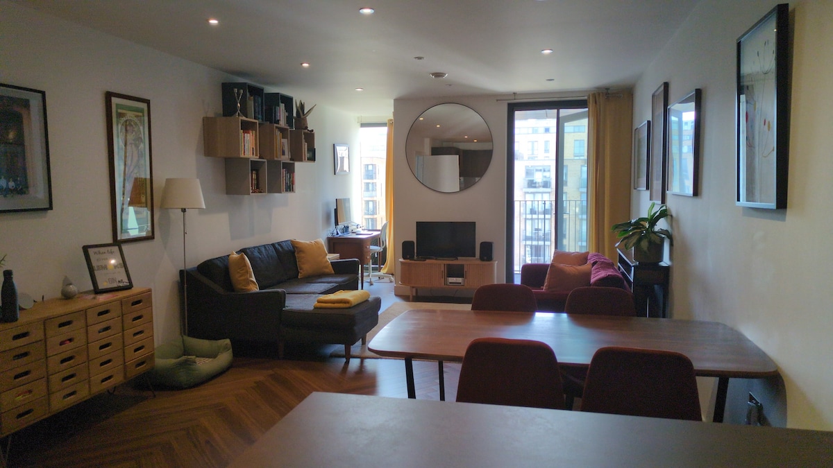Nestled in the heart of historic London, this sun-drenched apartment offers a peaceful retreat near Goldsmith University, historic Greenwich Observatory, and lively Peckham. Enjoy exceptional connectivity with 2 Overground, 2 rail, and a DLR station, London Bridge is 6 min train ride and buzzing Soho is 15min ride. Embrace Deptford's artistic vibe, complemented by a serene neighborhood. The apartment's vibrant ambiance, adorned with live plants, invites you to unwind on the charming terrace.