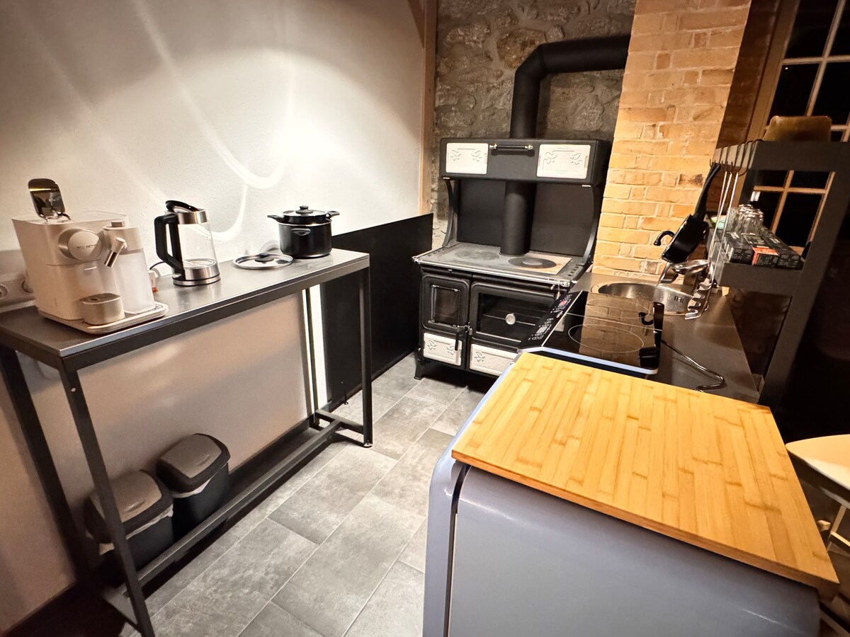 Tento promyšleně navržený dvoupokojový byt přesvědčí přehledným uspořádáním pokojů a vysoce kvalitním vybavením. Celkový obraz charakterizují elegantní materiály, zatímco moderní prvky, jako je sprcha, vířivka, soukromá sauna a krb, poskytují zvláštní pohodlí. V otevřeném obývacím prostoru je plně vybavený kuchyňský kout s dřezem, sporákem a myčkou. Zvláštním vrcholem je masivní, otočný dubový panel, který lze použít jako flexibilní jídelní stůl