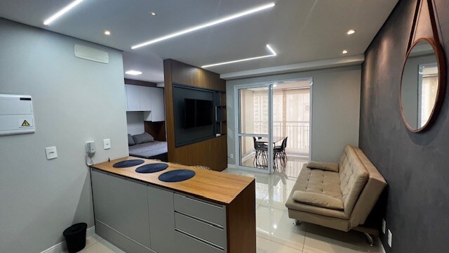 Studio recém-mobiliado, projetado para quem valoriza um ambiente funcional, elegante e bem localizado. A unidade acomoda até 2 pessoas e oferece cozinha completa com eletrodomésticos novos, sala com sofá e TV smart giratória (quarto/sala), cama de casal, banheiro moderno com ótimo chuveiro e sacada com mesa de jantar. Ideal para estadias de negócios ou lazer, com espaço para home office e estrutura pensada para uma experiência prática, eficiente e acolhedora em Guarulhos.