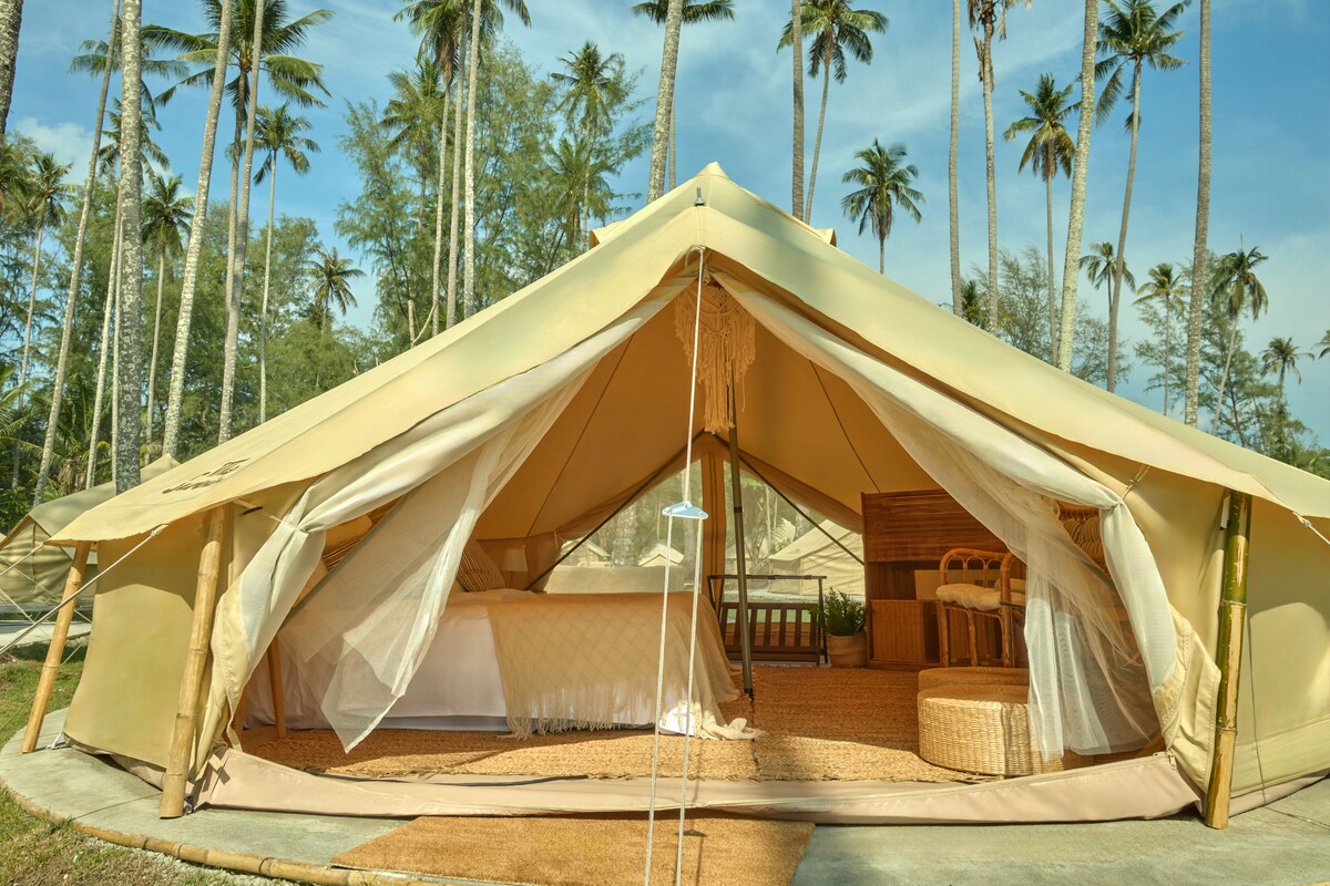 Luxusní útočiště s výhledem na pláž nabízející nádherný výhled na bílou písečnou pláž a Thajský záliv. Dopřej si klid našeho glampingového základu, který poskytuje velkorysý 70 m³ velký ráj. Toto soukromé útočiště se skládá z luxusního stanu s jednou ložnicí a soukromou koupelnou s oddělenými umyvadly pro něj a pro ni, sprchovým koutem s dešťovou sprchou pro luxusní zážitek a velkou terasou s prostorným lehátkem s výhledem na krásnou krajinu.