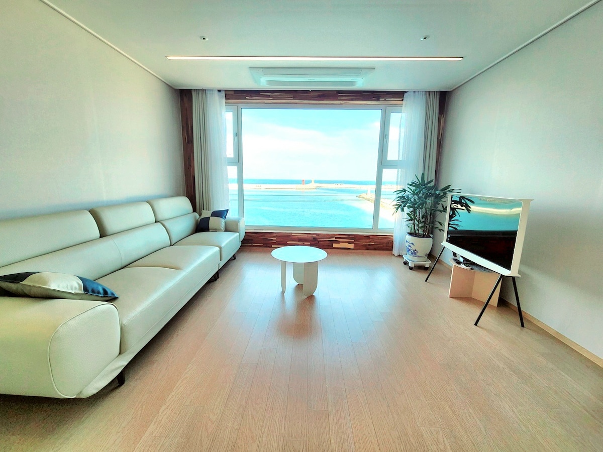 Signiel: Vedle kavárny Anmok, 5 metrů od moře, výhled na oceán, 34 pyeong, 6 lidí, východ slunce v obývacím pokoji