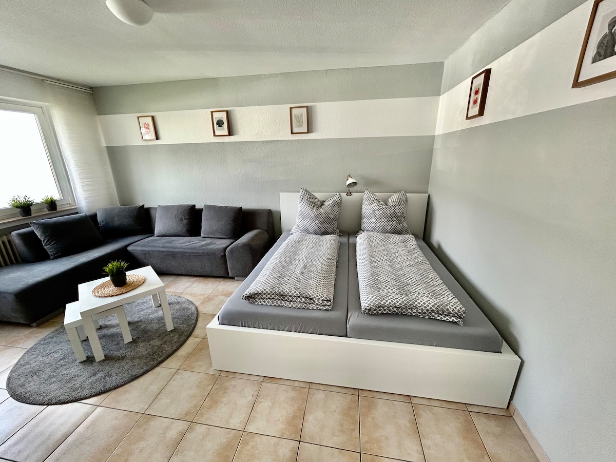 Před rezervací si prosím přečtěte aktuální předpisy týkající se koronaviru, které platí v Hagenu a Severním Porýní-Vestfálsku! Útulný moderní dvoupokojový apartmán pro až 4 osoby v rodinném domě. Na balkoně si můžete vychutnat nádherný výhled na Hagen! Klidná rezidenční oblast se skvělým spojením na dálnici a veřejnou dopravu (autobusová linka 517).