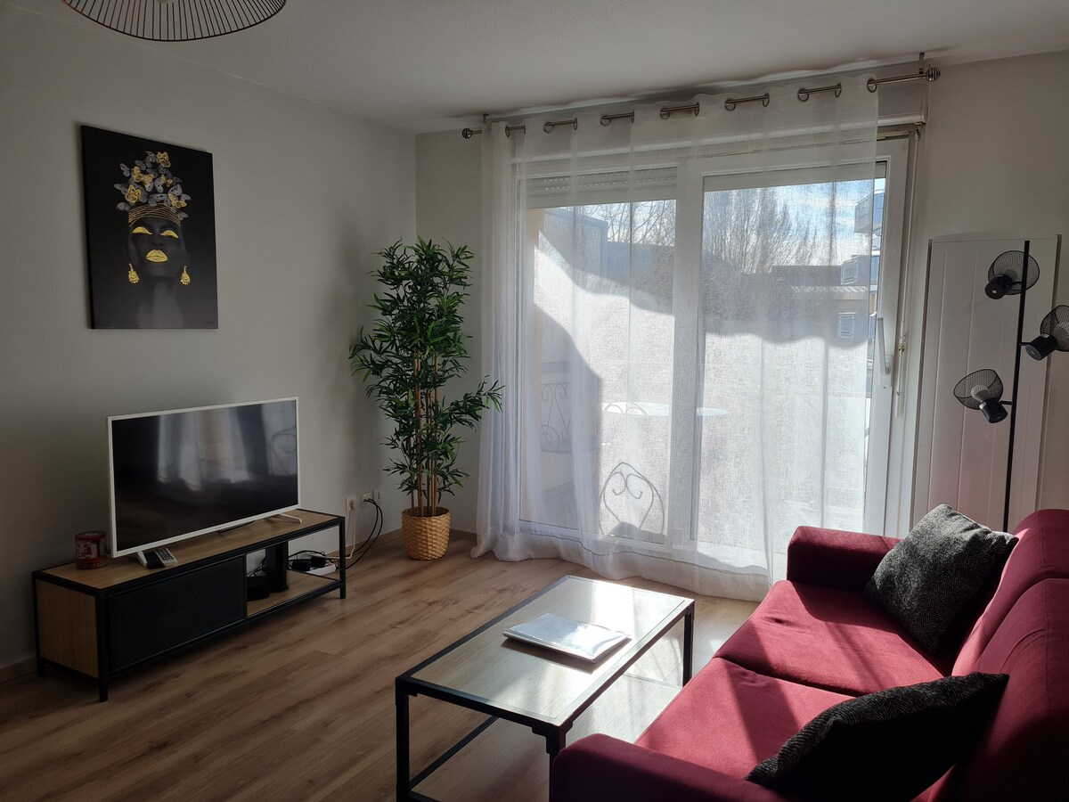 Velký světlý 2pokojový apartmán s terasou na jih a 2 parkovacími místy se nachází v centru města Haguenau. 3 hvězdičky 🌟 V ulici se nachází vodní centrum s bazénem, saunou, parní lázní a vířivkou. Nachází se v 1. patře rezidence bez výtahu, má ložnici a velký obývací pokoj s rozkládací pohovkou. Kuchyně je plně vybavená a toalety jsou oddělené. Koupelna je vybavena vanou se sprchou a pračkou.