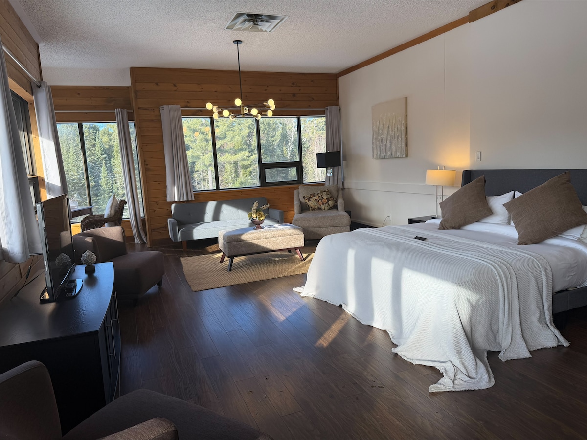 Relax in our stunning King Suite with a king bed, spacious living area, and breathtaking forest views. Enjoy a beautifully designed interior, full bathroom with glass shower, fluffy towels, high-speed WiFi, internet TV, a work desk, and an in-room iPad for easy access to all amenities and concierge services.