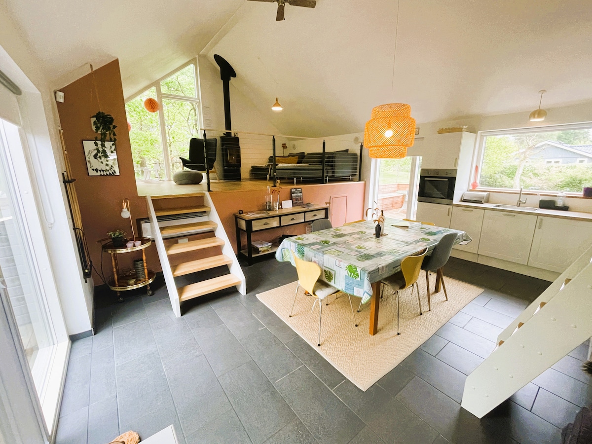 Lovely modern 99 m² holiday home "VillaHou" for 6 guests. Two bedrooms with double beds, large loft with standing height and 2 extra beds. Modern kitchen and living area on split levels with wood stove, alcove, air conditioning and internet. Spacious natural plot with cosy corners, wooden terraces, vildmarksbad (wood-fired hot tub), outdoor shower and fire pit. 1 km to Hou with harbour, shops, restaurants, playgrounds and child-friendly beaches. Perfect for relaxation and nature.