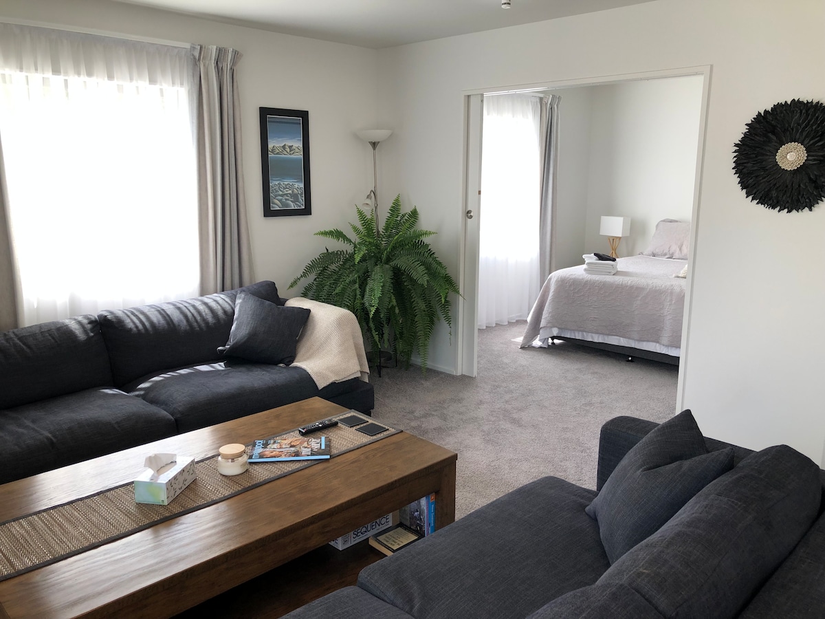 Beautiful, sunny, lovingly built, modern self contained studio. Everything you could need for a short stay in Christchurch; located in a quiet cul-de-sac less than 10 minutes from the airport, and 18 minutes to city centre. Fast WiFi, Smart TV with Netflix, private bathroom with high pressure shower, kitchenette with mini fridge, Nespresso coffee machine, jug and toaster. Cereals and milk provided for breakfast. Private access and your own private deck on which to relax outdoors