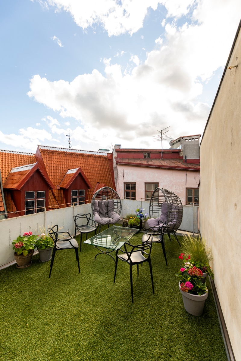 Přesuň se z ložnice do sauny a na otevřenou terasu v rafinovaném apartmánu s pozoruhodnými moderními prvky. Okna se zvedají až k 5 metrů vysokým stropům a kruhová zrcadla se třpytí ve světle. Parketové podlahy a nadýchané textilie dodávají hloubku a teplo. Podkrovní byt se nachází ve stylovém bytovém domě, jen pár minut od Starého města, hned vedle kreativního centra Kultuurikatel. Prozkoumej trendy, bohémské čtvrti Telliskivi a Kalamaja a jedinečné Staré město.