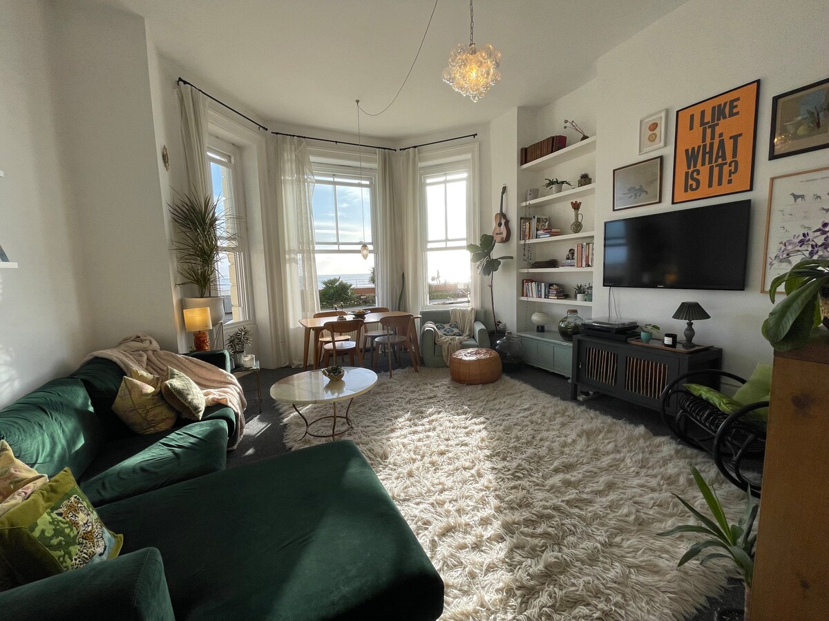 Nádherný, prostorný byt orientovaný na jih s nádherným výhledem na moře, originálními prvky a vysokými stropy. Východy/západy slunce a odrazy měsíce jsou úchvatné! Mezi St Leonards on Sea a Hastings, a 30 sekund na pláž! Ložnice má manželskou postel a obývací pokoj rozkládací pohovku pro dvě osoby. Ložní prádlo je bavlněné/lněné a prané netoxickými produkty. Byt je ve 3. patře, ale není to tolik schodů a výhled na moře je daleko od davů! V okolí je bezplatné parkování