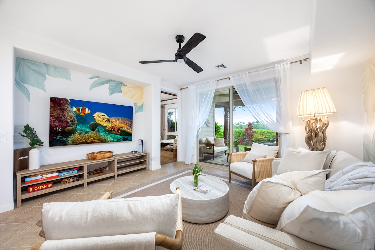 Nadměrná, vkusně zařízená a vylepšená rohová jednotka na pobřeží oceánu v žádaném letovisku Mauna Lani. Nově zrekonstruováno profesionálním designérem! Západ slunce a výhled na golfové hřiště. Nástěnné malby s havajskou tématikou, stylová černobílá hlavní ložnice s vanou a sprchovým koutem, ložnice s manželskou postelí v 1. patře, 50 stop od parkoviště (bez schodů), zábavná kombinace dvoulůžka/king size postele v dětském pokoji nahoře. Plně zásobená kuchyně, vybavení pro děti (jídelní židlička, vanička), moderní obývací pokoj, podkroví, 2 kancelářské prostory, vybavení na pláž, kola, hry, PS5. Pohodlí a styl pro všechny věkové kategorie!