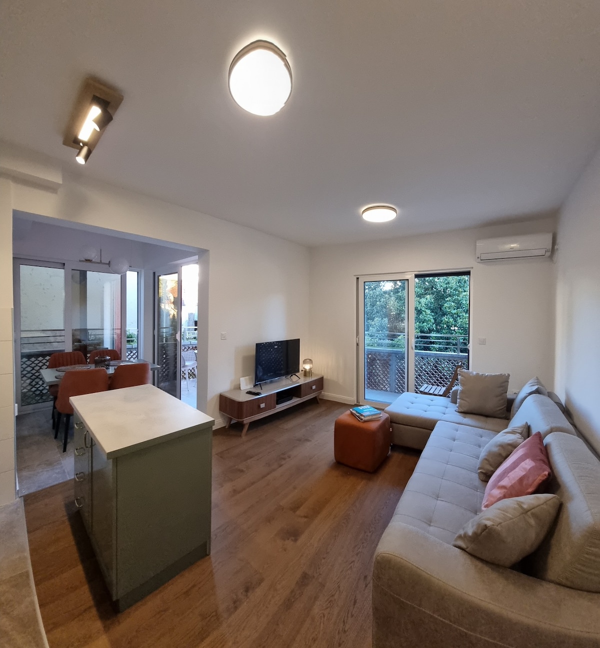 Stylový apartmán se 2 ložnicemi jen 300 m od moře v klidném Đenovići. Vychutnej si nádherný výhled na Jaderské moře ze soukromého balkonu, elegantní moderní interiéry a plně vybavenou kuchyň. Dokonalý pobyt na pobřeží – v blízkosti kaváren, promenády v přístavu a krátká procházka do Porto Novi. Ideální pro relaxační pobyt na krásném pobřeží Černé Hory. Klíčové vlastnosti: - Výhled na moře - Plně vybavené – Klimatizace v obývacím pokoji a obou ložnicích – Vyhrazené parkovací místo – S kontrolovaným přístupem