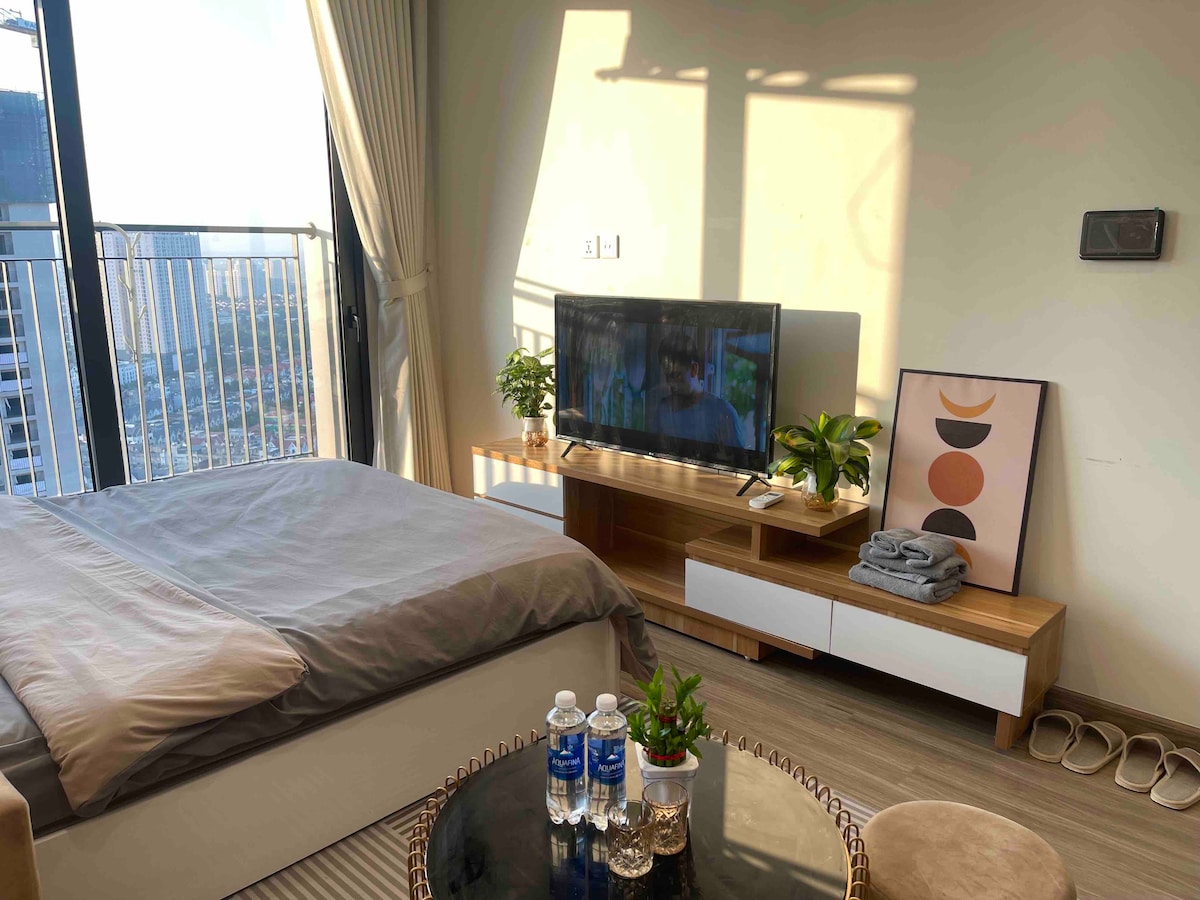 Moderní apartmán ve Vinhomes SmartCity s velkými prosklenými dveřmi s plnou stěnou, otevřeným výhledem na jezero a plným přirozeným světlem. Plně vybaveno: měkká postel, kuchyň, pračka, vysokorychlostní wifi. Kuchyně má dostatek kuchyňského náčiní, hrnců a pánví, základního koření. Odpočiňte si u velkého projektoru a sledujte Netflix přímo v pokoji. Vhodné pro zahraniční hosty, krátkodobé obchodní cesty nebo relaxační dovolenou.