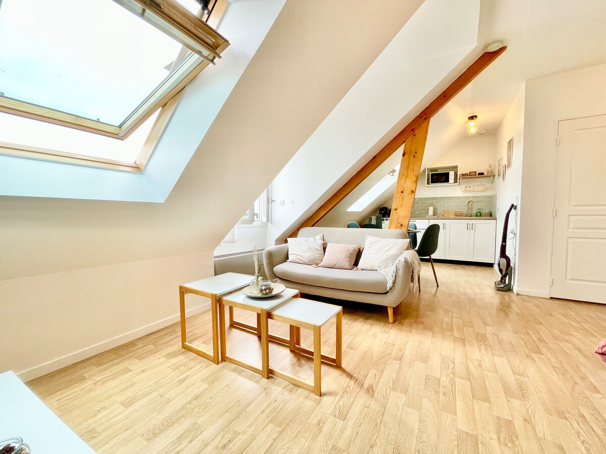 Dodržujeme všechna nová pravidla úklidu související s COVID-19. více než 400 5hvězdičkových hodnocení pro toto studio zalitý klidem a světlem, které se nachází v historickém centru v čtvrti Sainte Catherine, s výhledem na nádherný kostel s jedinečnou samostatnou zvonici ve Francii. Pár kroků od všech obchodů, restaurací a muzeí ve městě. Dodávám, že můj ateliér je tříhvězdičkový podle Calvados Tourisme (státní organizace).