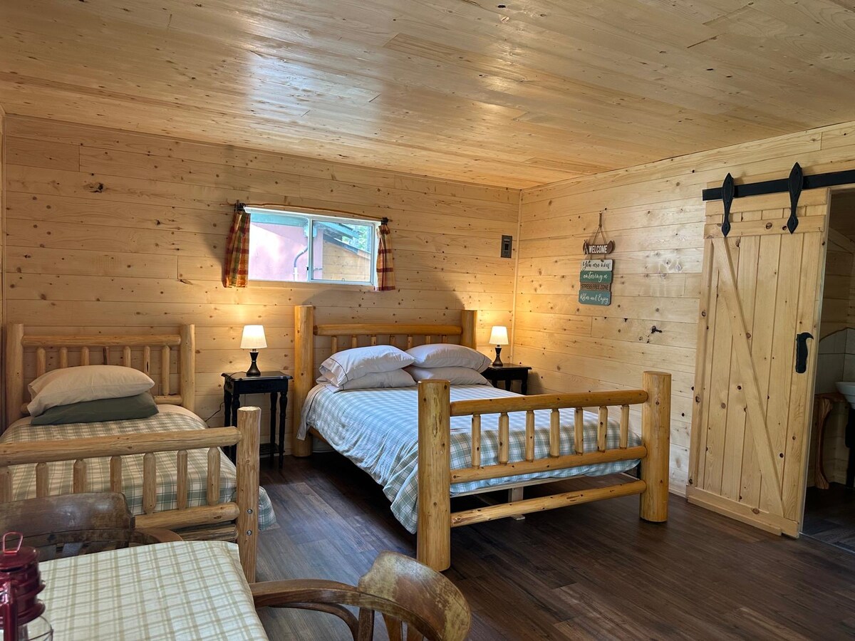 This gorgeous, spacious cabin sleeps 4 people with 1 queen sized bed and 2 single beds. (it can sleep up to 6 with the 2 sofa beds). In the center of the cabin sits a beautiful wood stove, so on those chilly nights you can snuggle up next to the fire and get toasty. It has 2 bedrooms, 1 bathroom, a fully equipped kitchen, dining area, living room, wireless Internet, a bluetooth speaker and a private deck with chairs, picnic table and barbecue.
