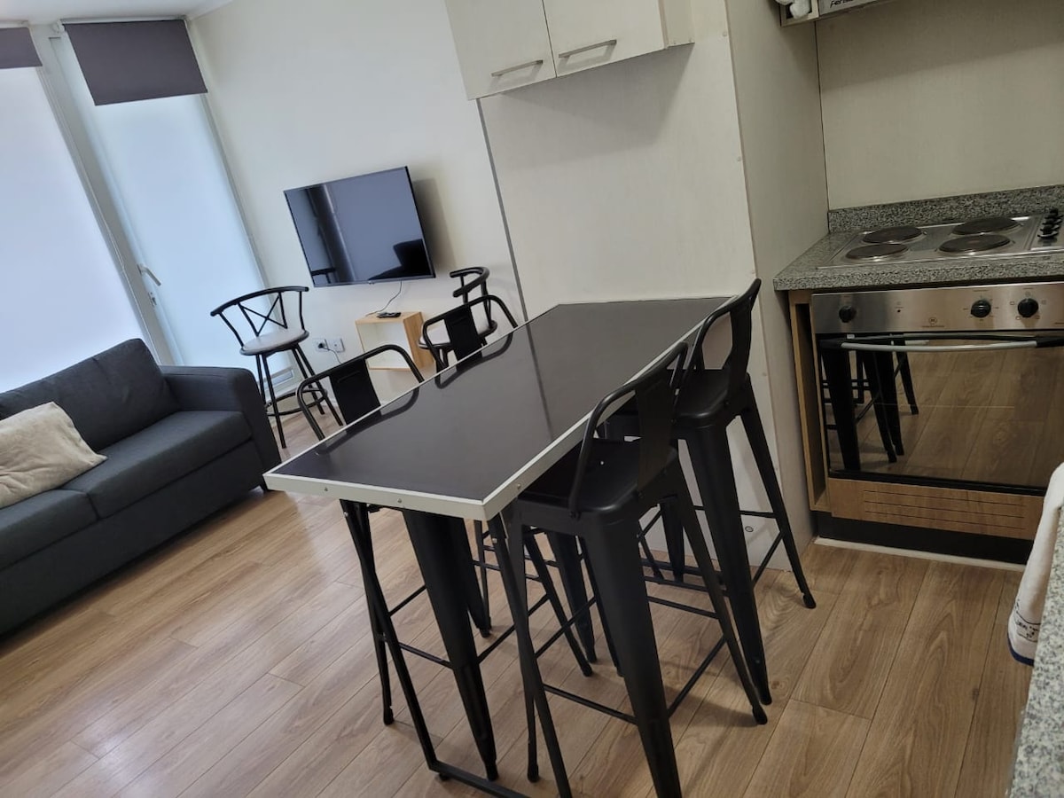 Krásný apartmán v Hualpénu, provincie Concepción, ideální pro turistiku po velkém Concepciónu nebo pro služební cesty, 8 minut od kasina Marina del Sol, 8 minut od nákupního centra Mall del Trébol, 15 minut od centra Concepciónu, 15 minut od Caleta Lengy. V exkluzivním soukromém kondominiu, bezpečné a klidné, krásný výhled. Vybaveno pro 2 osoby Plně vybavená kuchyně. Bazén Prádelna $ Výtah Posilovna (po předchozí rezervaci u vrátného) Parkování Doprava až ke dveřím, poblíž BioTren.