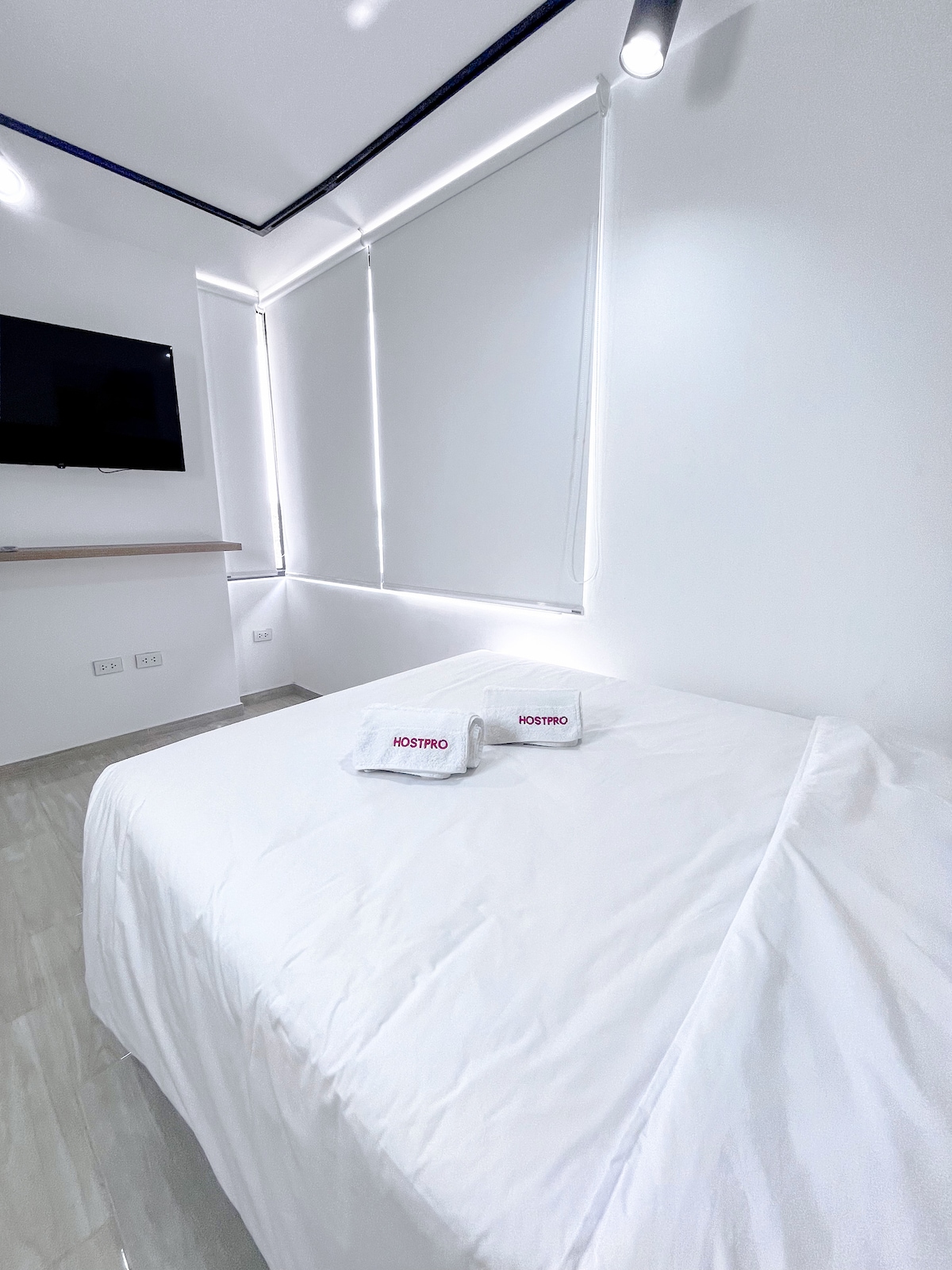 Cuenta con dos habitaciones: la principal con cama queen, armario y baño completo; la segunda con cama de dos plazas, armario y baño completo externo. Disfruta de una sala con muebles y comedor para 4 personas. Una acogedora sala de TV con mesa de estudio y silla, ideal para trabajar o relajarte. Además, el departamento ofrece una terraza al aire libre con mesa y dos sillas, perfecta para tomar un café o descansar. Un espacio cómodo, funcional y bien ubicado para estancias de trabajo o descanso.