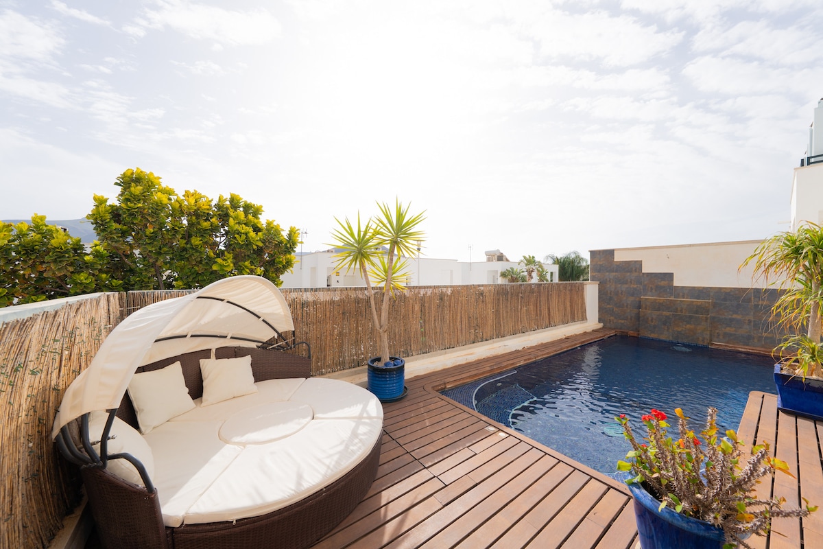 Jedinečná vila se 3 ložnicemi (almeriavilla) se nachází v srdci pohoří Sierra Cabrera a nabízí 360° výhled na nejpozoruhodnější západy slunce. Nachází se pouhých 20 minut od modrého moře na pláži Mojacar, kde si můžete vybrat ze široké škály barů a restaurací. Dům je místem klidu a odpočinku. Má vnitřní terasu v maurském stylu se soukromým bazénem zasazeným do skály, ideální pro ochlazení v horkých letních dnech. Přední terasa a několik dalších balkonů s ničím nerušeným výhledem na hory.