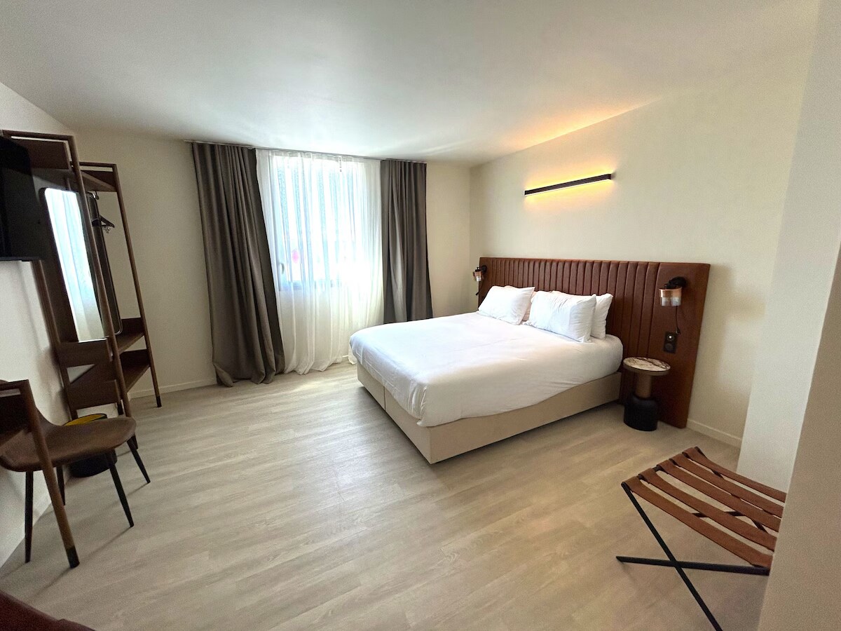 Za velkým oknem zálivu objev světlý pokoj v teplých tónech. Soukromá terasa ti umožní ocenit okolní přírodu. Tento pokoj se nachází v hotelu Les Terrasses du Bailli a je ideální pro pohodlný pobyt a snadný přístup k recepci, jídelně a bazénu. Ložnice vhodná pro osoby s omezenou pohyblivostí.